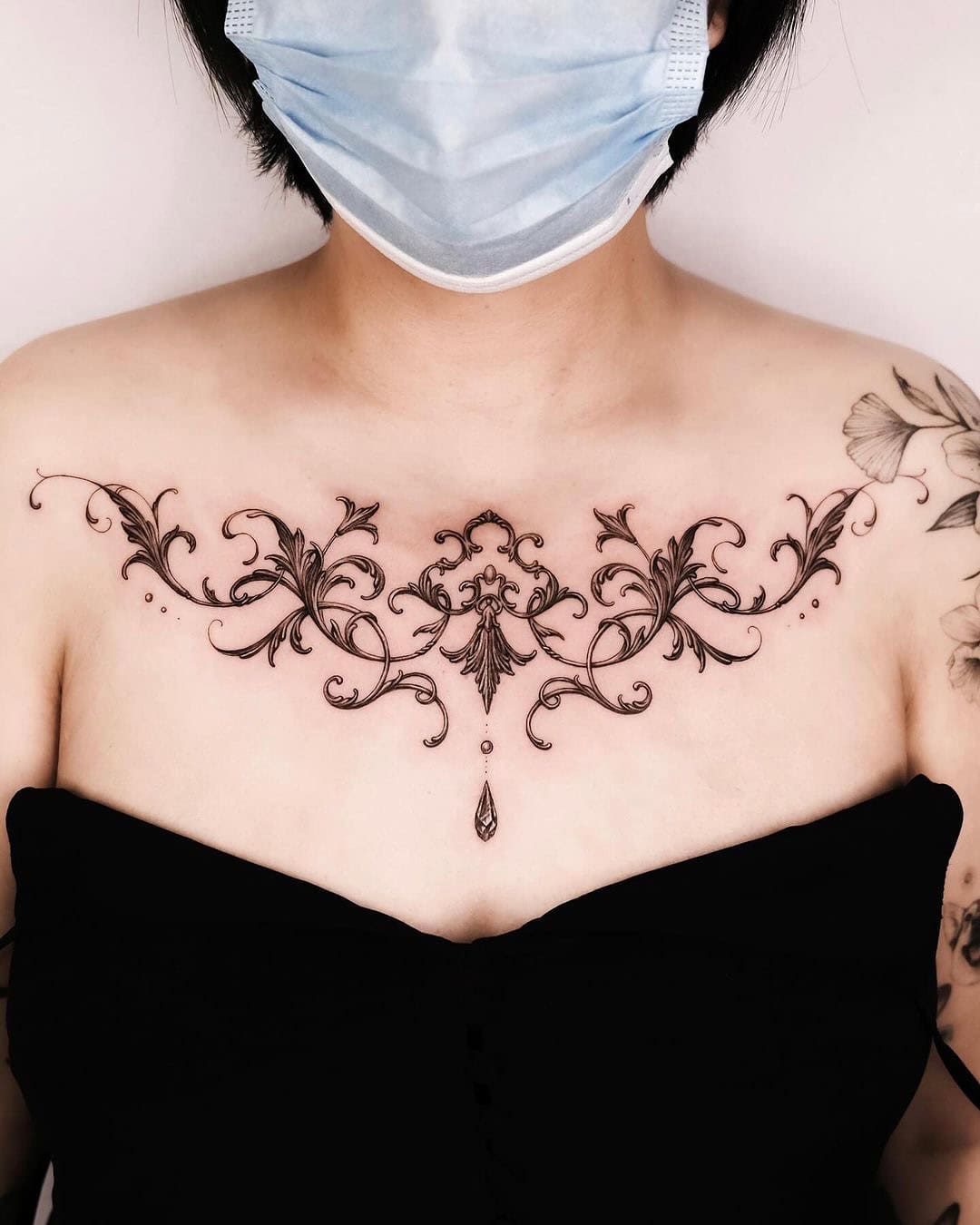 The intricate design has elegant swirls and a delicate drop, which adds a touch of sophistication to the entire look. For those thinking about a chest tattoo, picking a unique pattern that reflects your personal style can make all the difference.