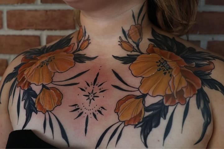 I love the pop of color in this piece. This stunning chest tattoo features vibrant orange flowers that blend with intricate black details so beautifully.