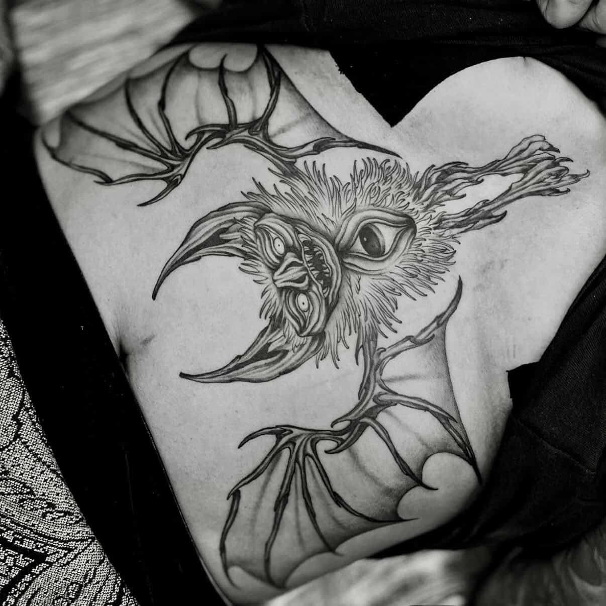 If you want something truly unique, this is it. This striking tattoo features an original creature that blends elements of a bat and a mythical being, making it a total standout.