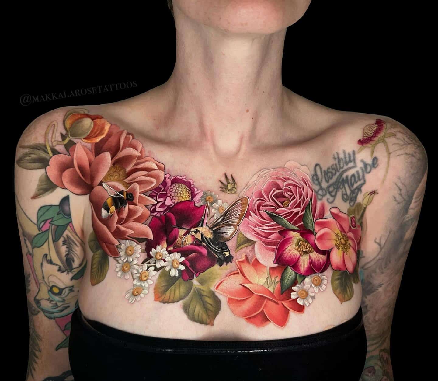 Obsessed is an understatement. This image puts a stunning floral chest tattoo on display, just bursting with color and life.