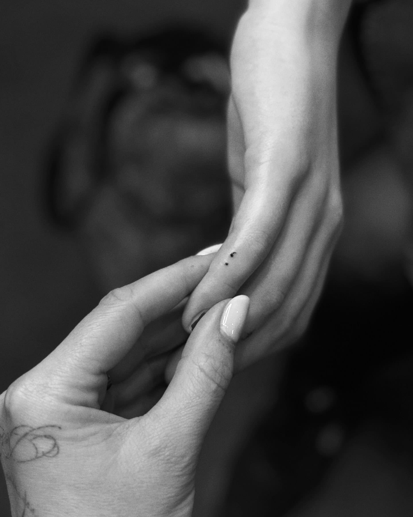I am obsessed with celestial themes, and this is such a good one. A tiny crescent moon tattoo is placed right on the finger, and it’s surrounded by even tinier dots that give it such a delicate touch.