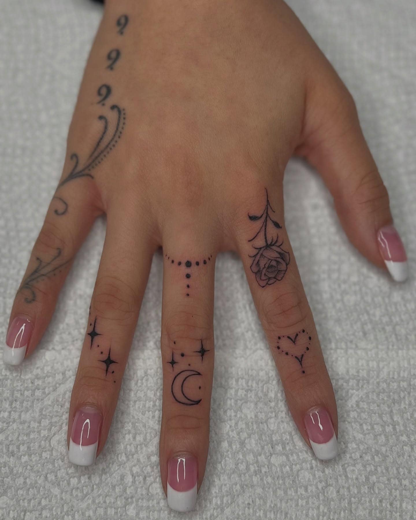 I love that the use of fine lines and varying sizes makes each tattoo feel distinct while still maintaining a cohesive look across the whole hand.