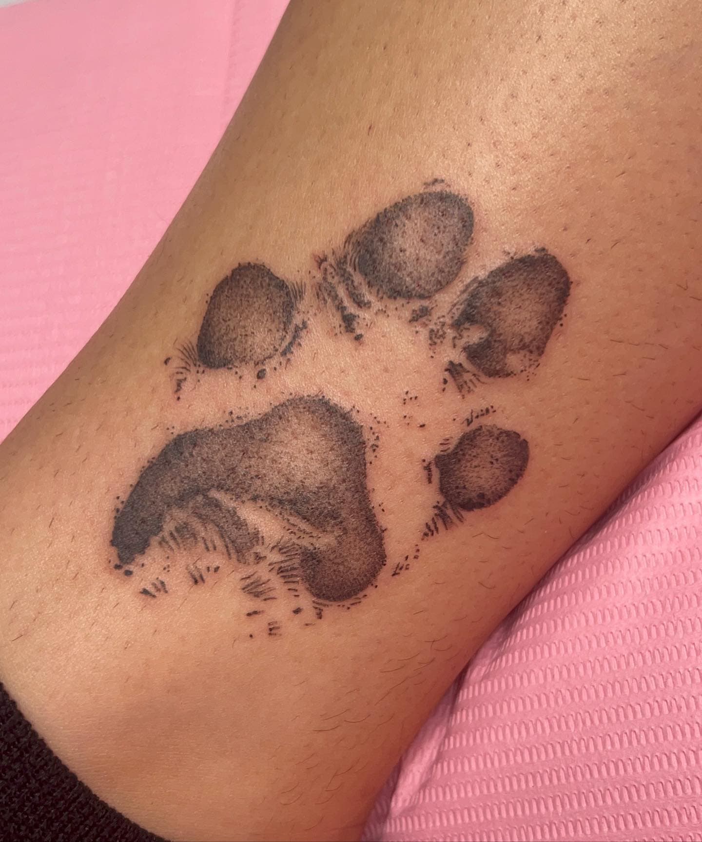 This tattoo is just perfection. It has a beautifully detailed paw print that perfectly captures the essence of a beloved pet.