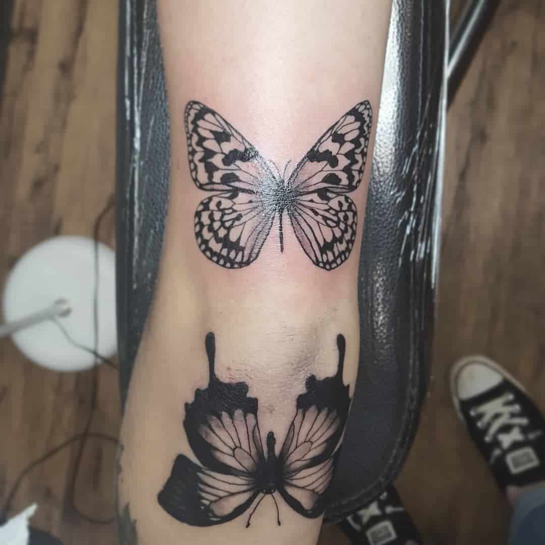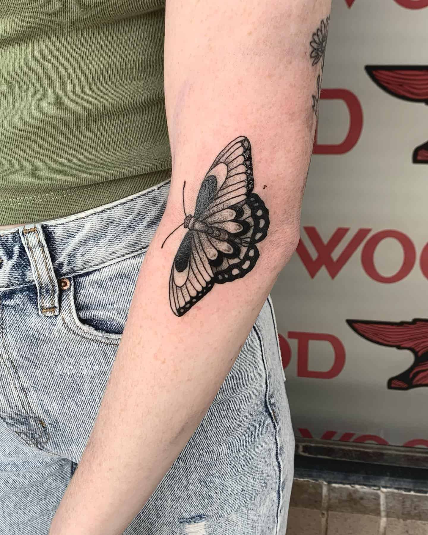 The tattoo features a large butterfly with intricate wing patterns and shading. It’s a total classic!