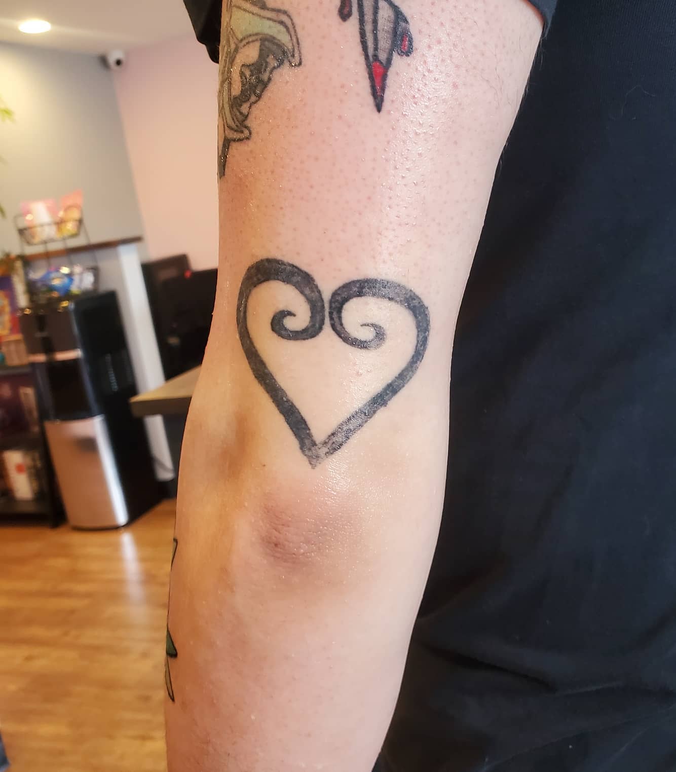 I love the unique shape of this tattoo. It features a heart shape with swirling ends, which gives it a really eye-catching appearance.