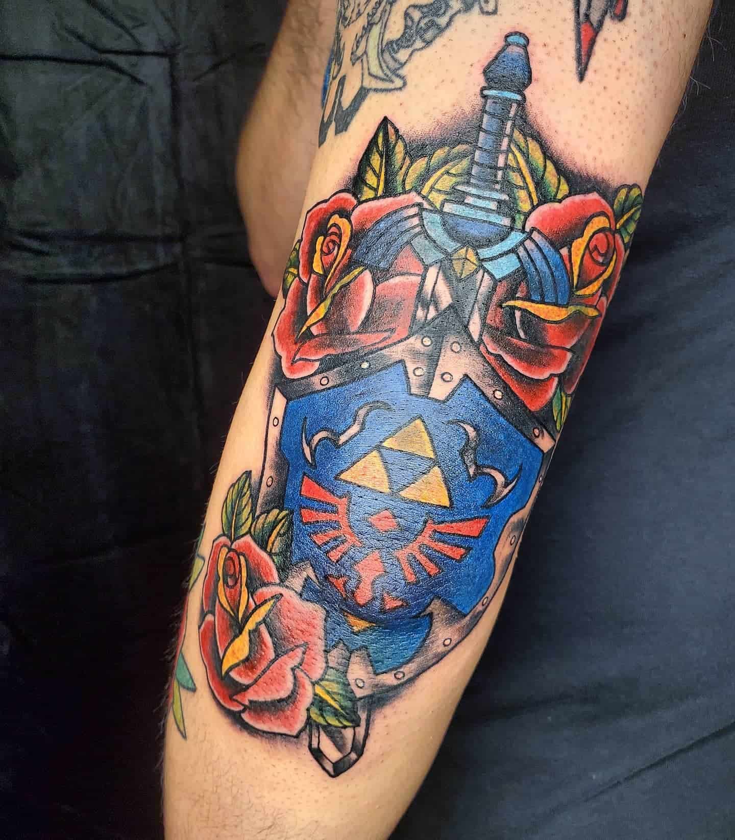 I am so into this design! The tattoo has a really vibrant blue shield that’s decorated with red roses, which creates such a cool contrast.