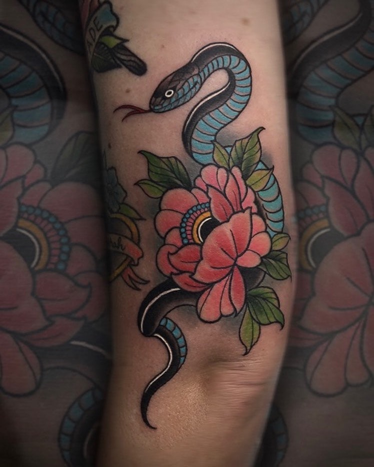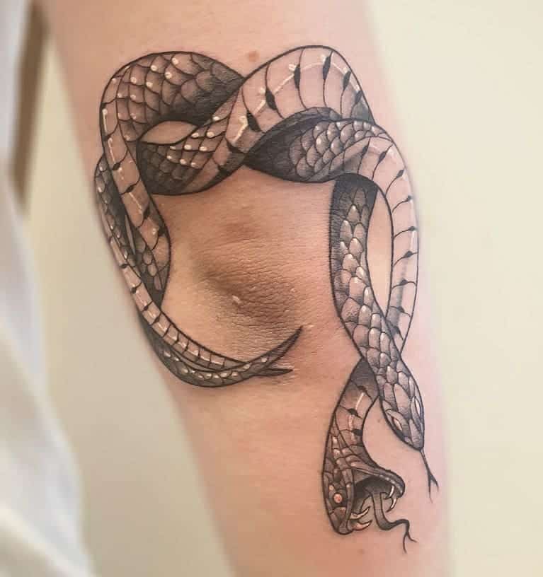 This tattoo has such amazing movement. It features two snakes that are intricately entwined, creating a dynamic and flowing design right around the elbow.