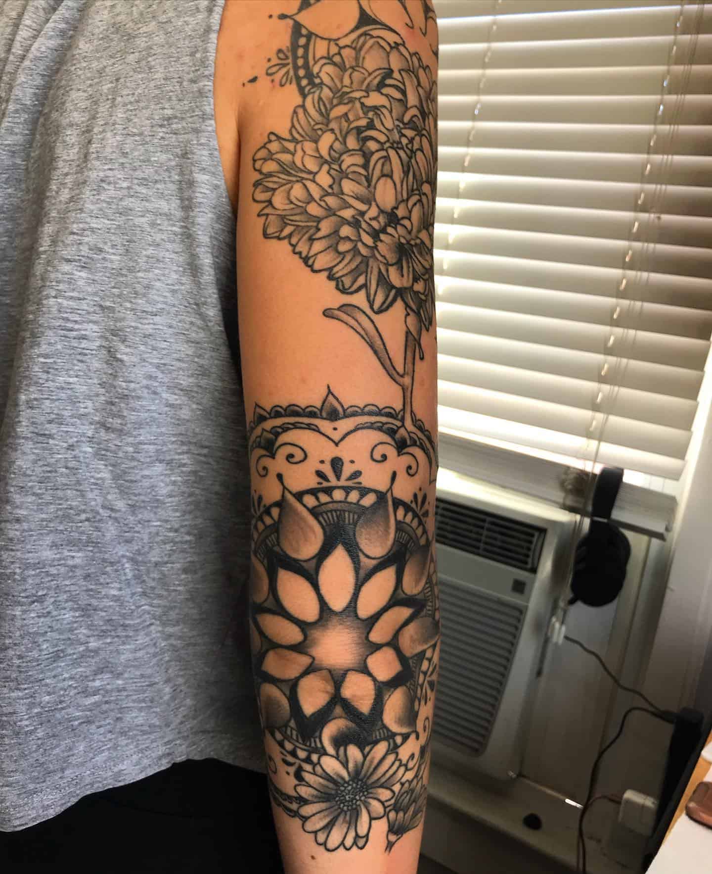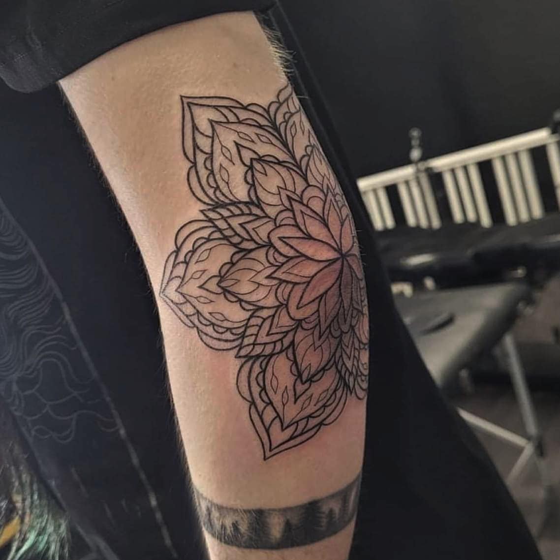 This tattoo features a blend of floral elements and intricate mandala patterns that wrap so nicely around the elbow area.