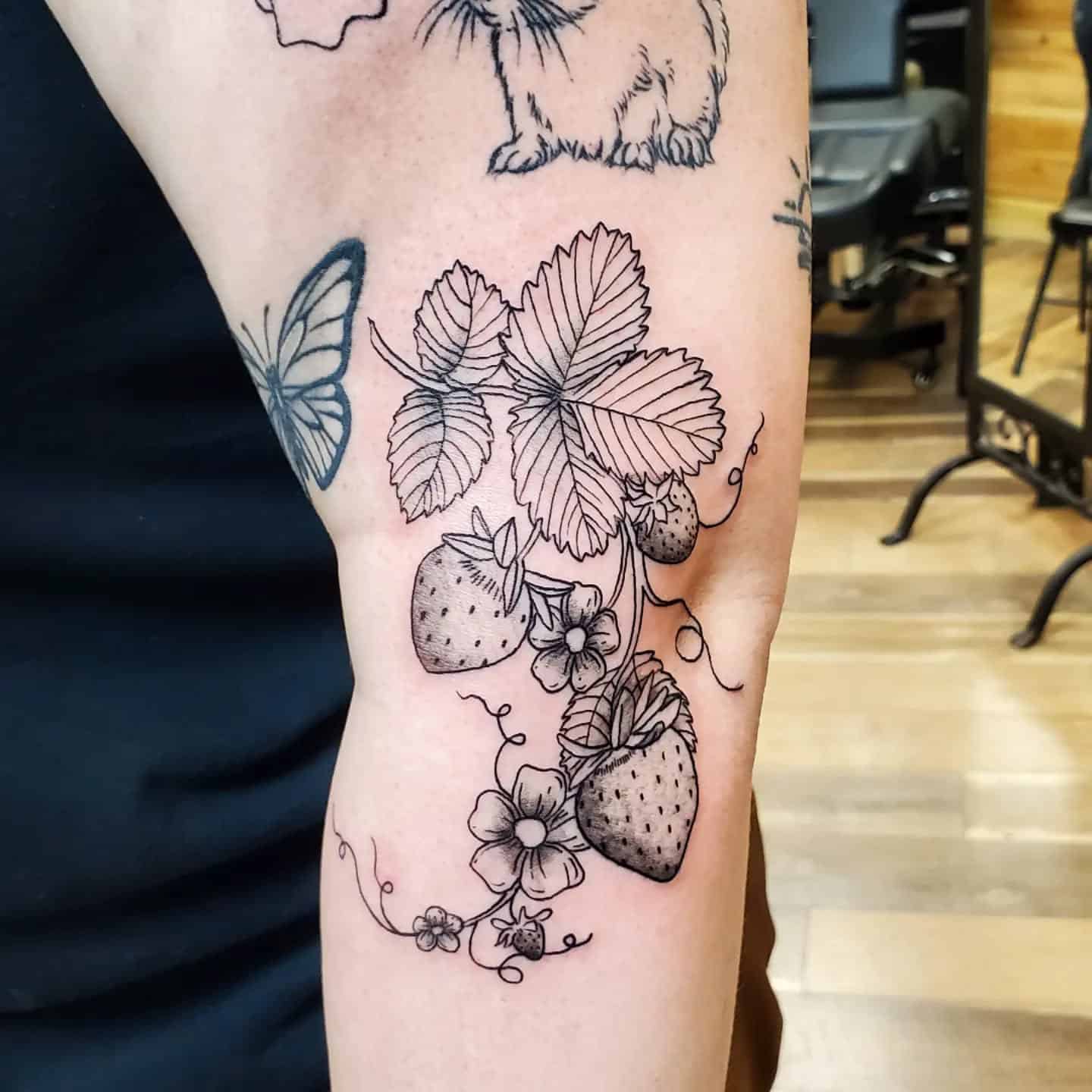 I just love a fun, colorful piece like this one. The tattoo features a detailed design of strawberry plants, complete with leaves, flowers, and ripe strawberries.