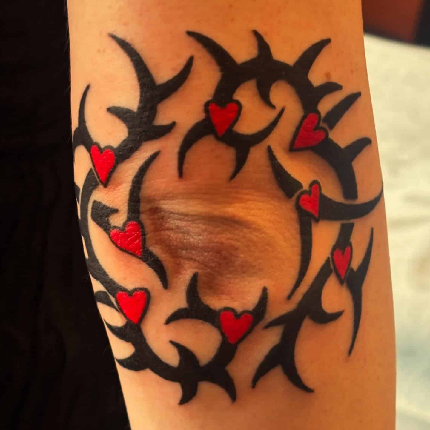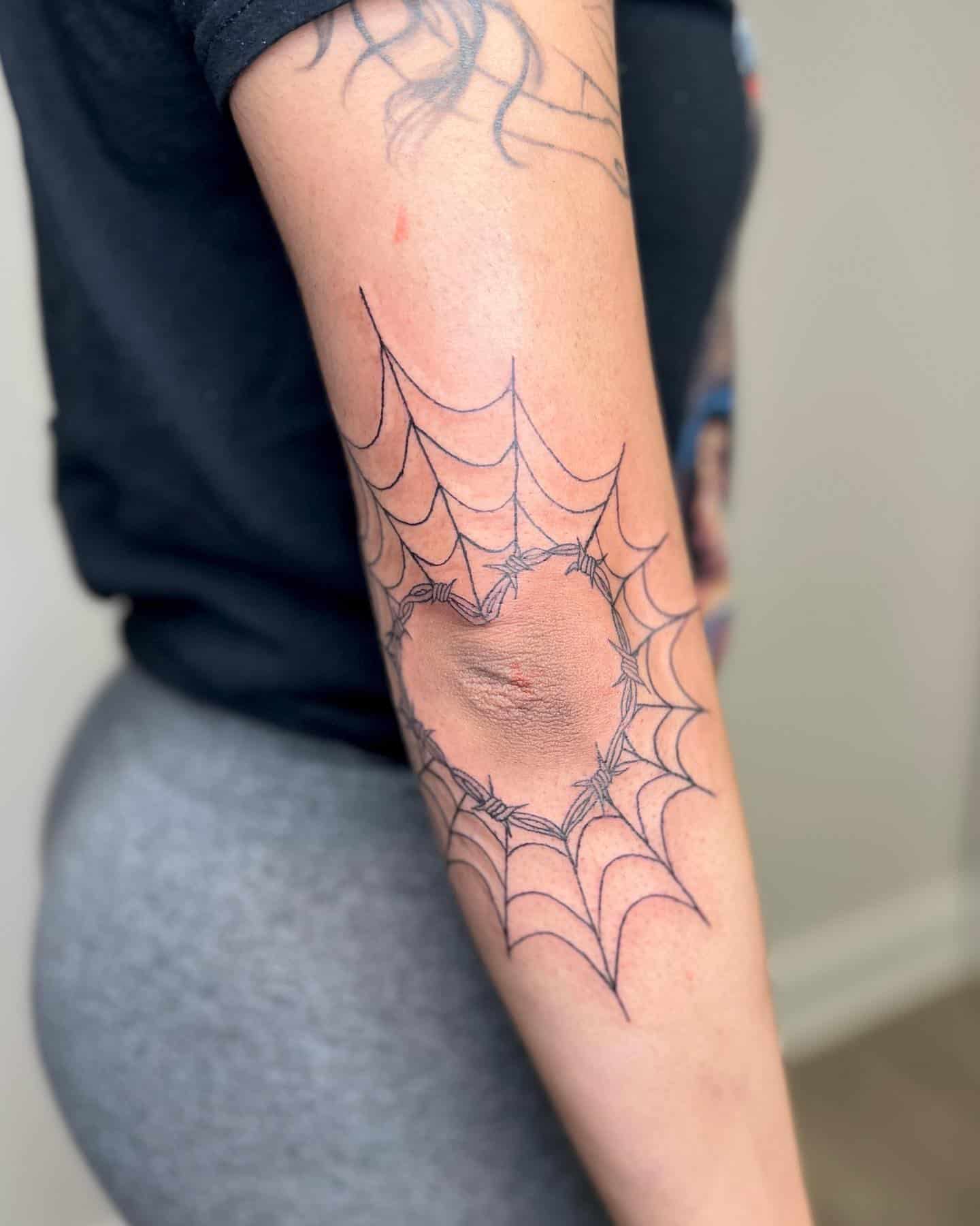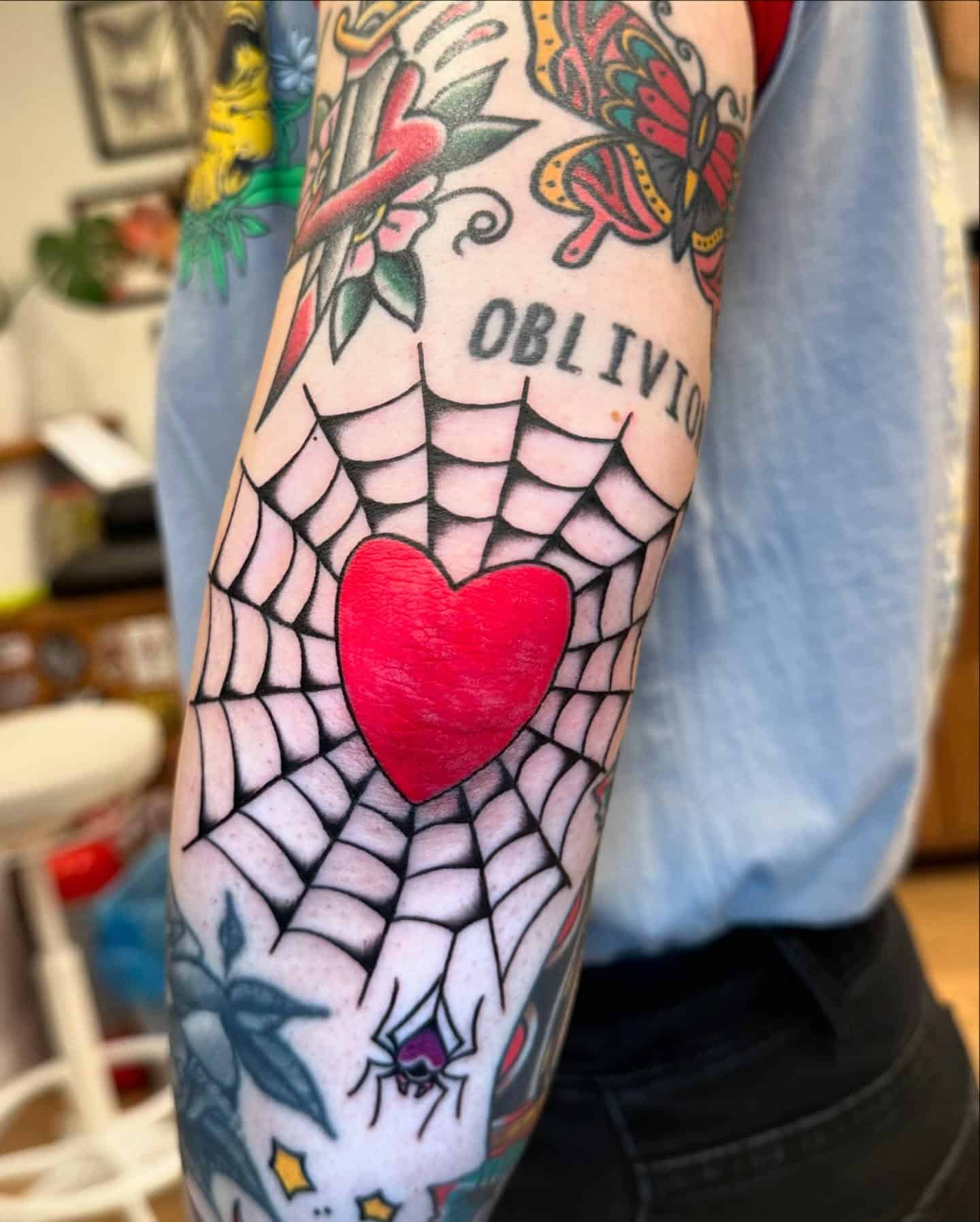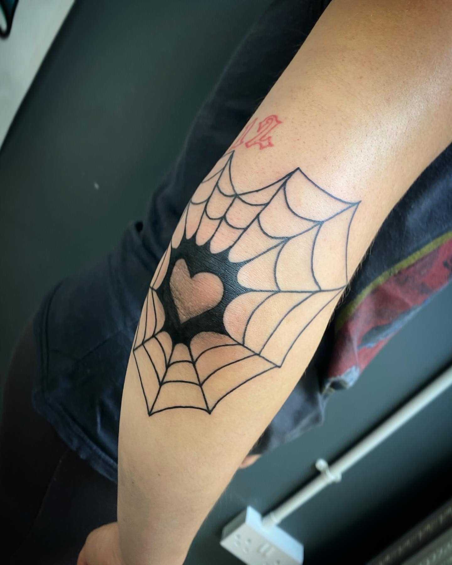 This tattoo is such a fun mix of styles. It features a spiderweb design that’s displayed prominently on the elbow, and it’s accented by a heart-shaped cutout right in the center.