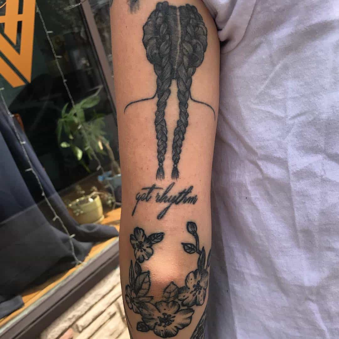 This tattoo is just so unique! It features a detailed image of braided hair alongside some really delicate floral designs.