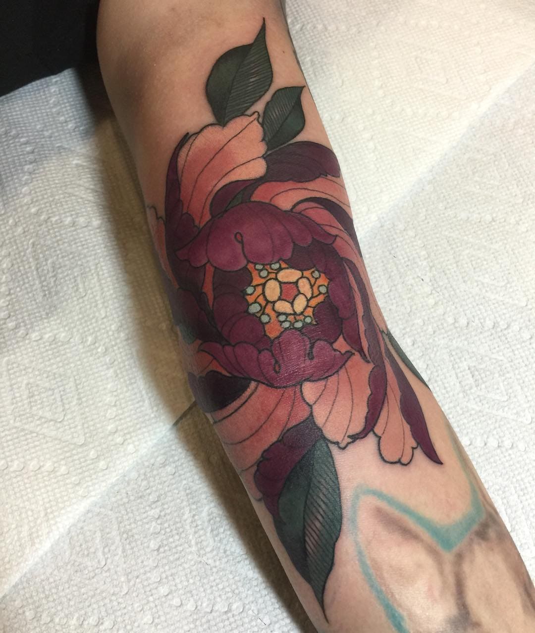 This tattoo makes such a statement! A large, colorful flower dominates the elbow area, and it showcases rich shades of deep purple and soft peach.
