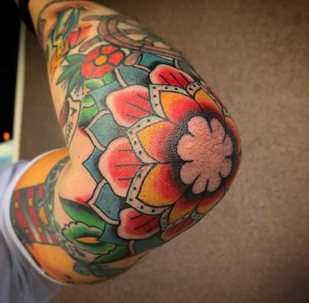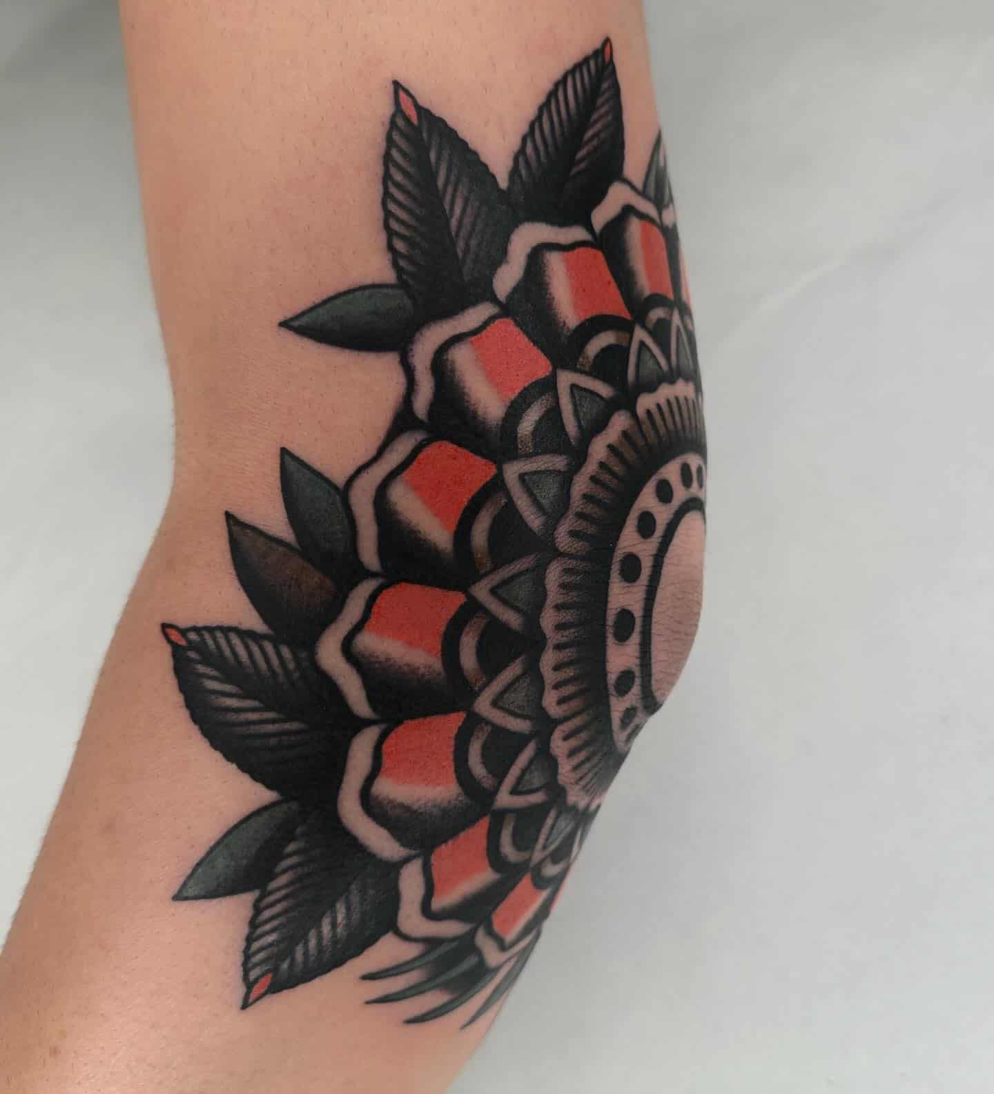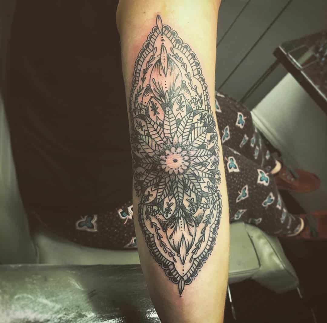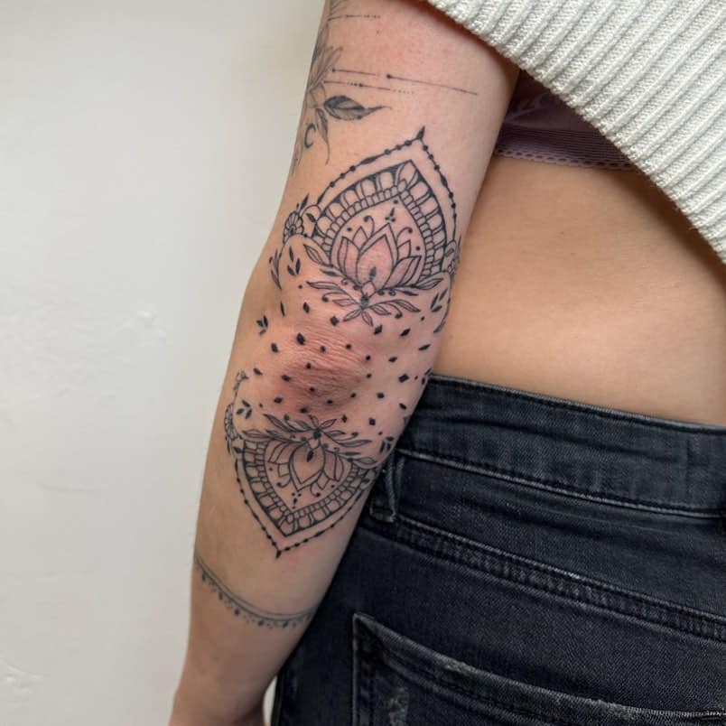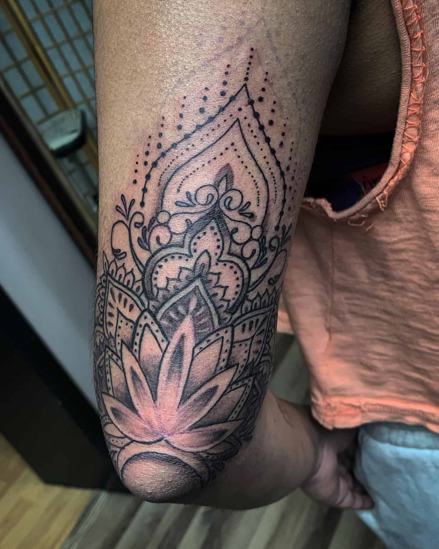 You can really see the artistry in this piece. The tattoo has a detailed mandala design that wraps around the elbow, and it showcases some intricate patterns and floral elements.