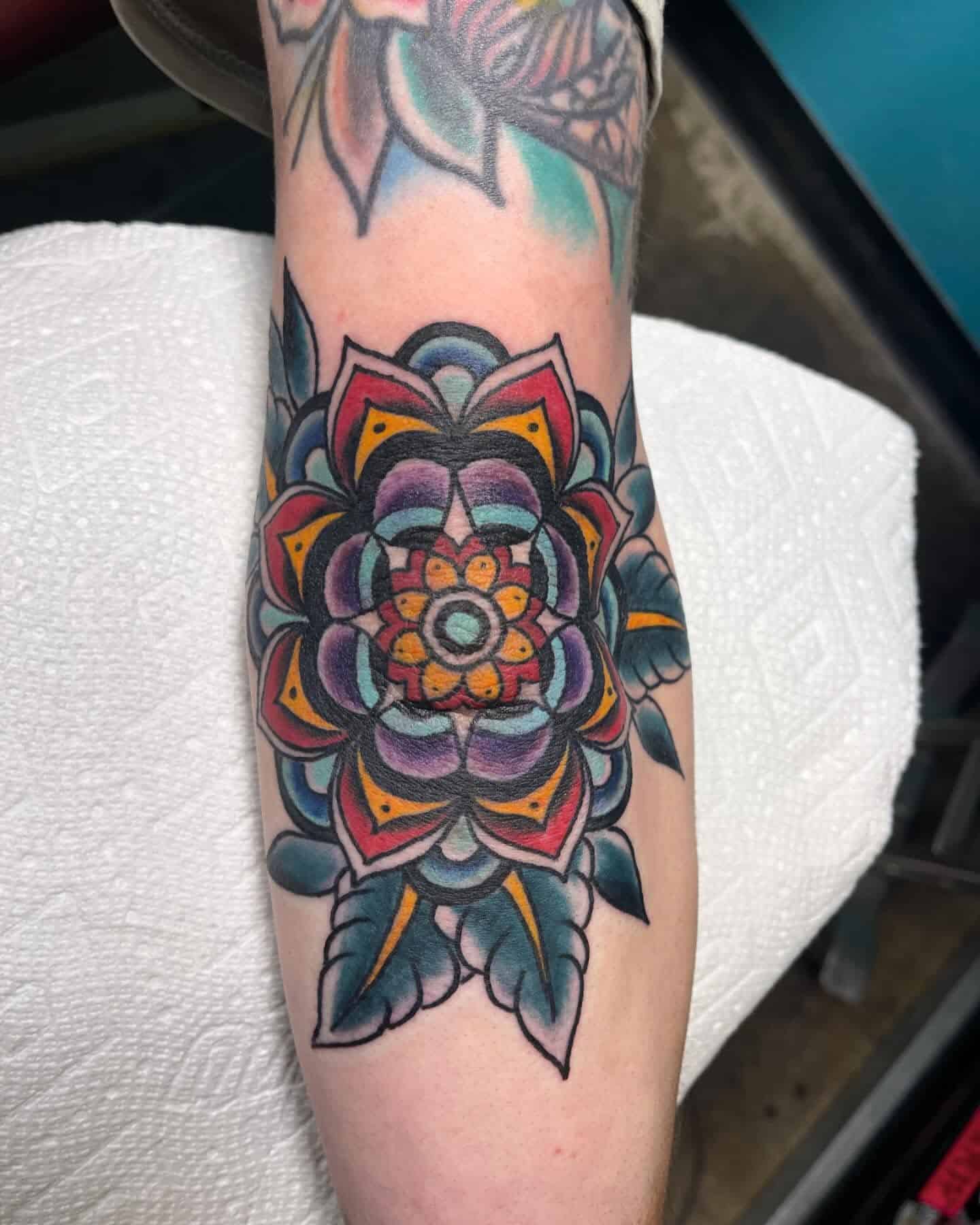This elbow tattoo has a striking mandala design that’s surrounded by vibrant petals and detailed leaves.