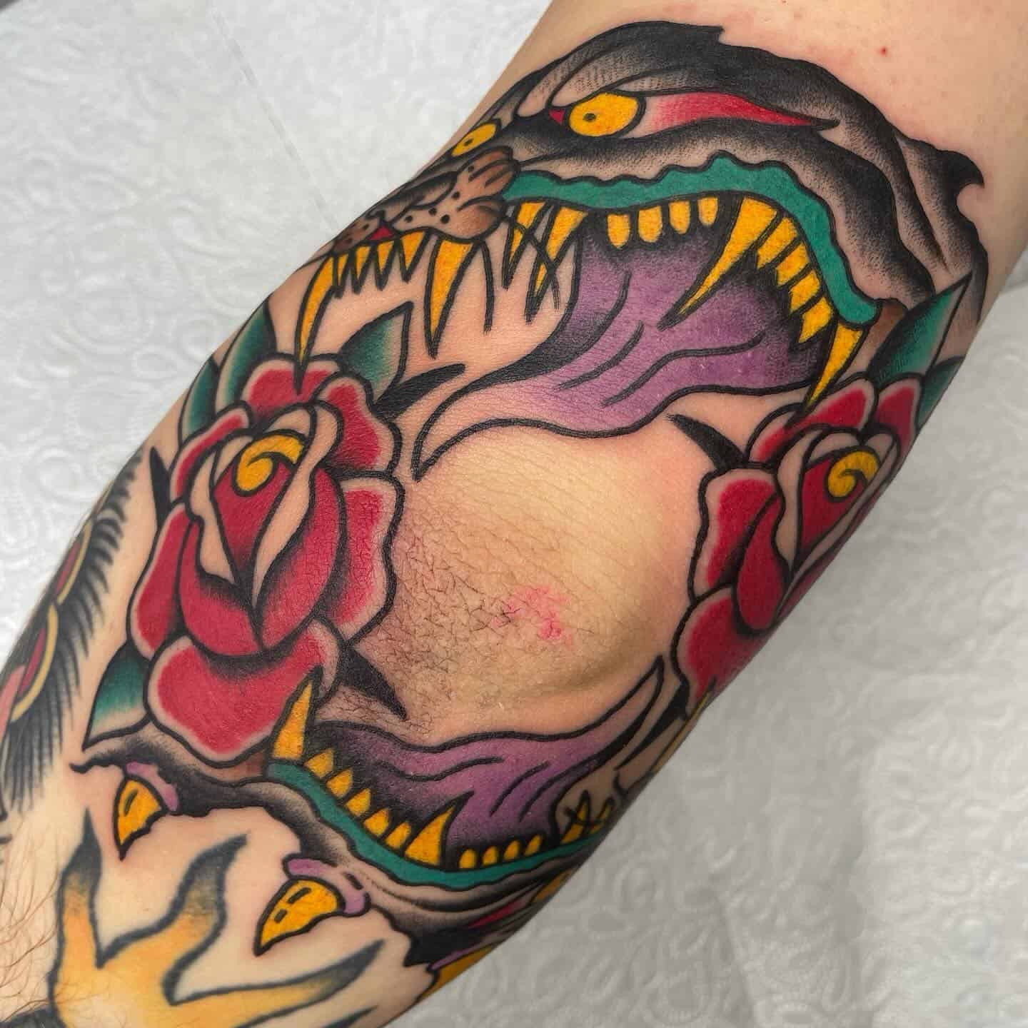 I am obsessed with the colors in this tattoo! It features a vibrant blend of roses and a fierce creature with sharp teeth.