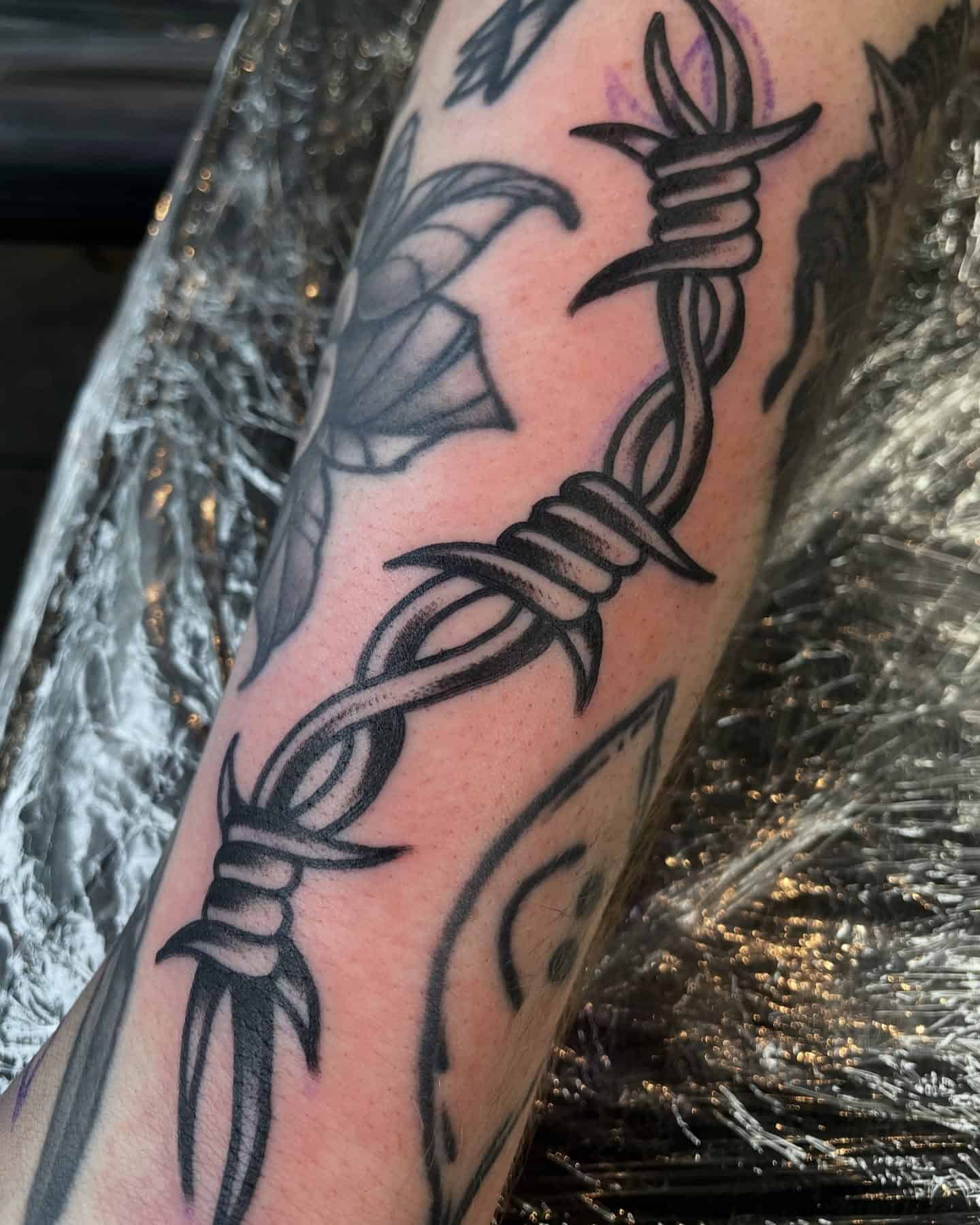 I love the look of this tattoo! It features a barbed wire design that wraps so elegantly around the elbow area.