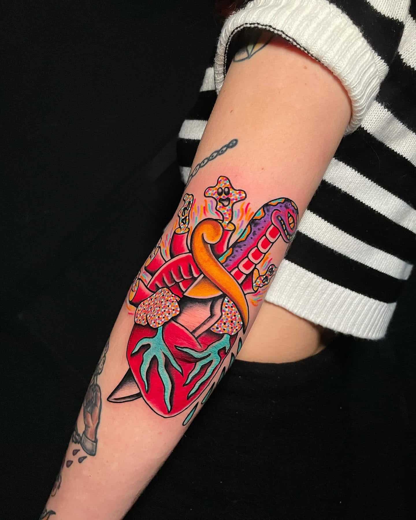 This tattoo is so vibrant! It features a heart intertwined with a snake, and it creates such a striking visual impact.
