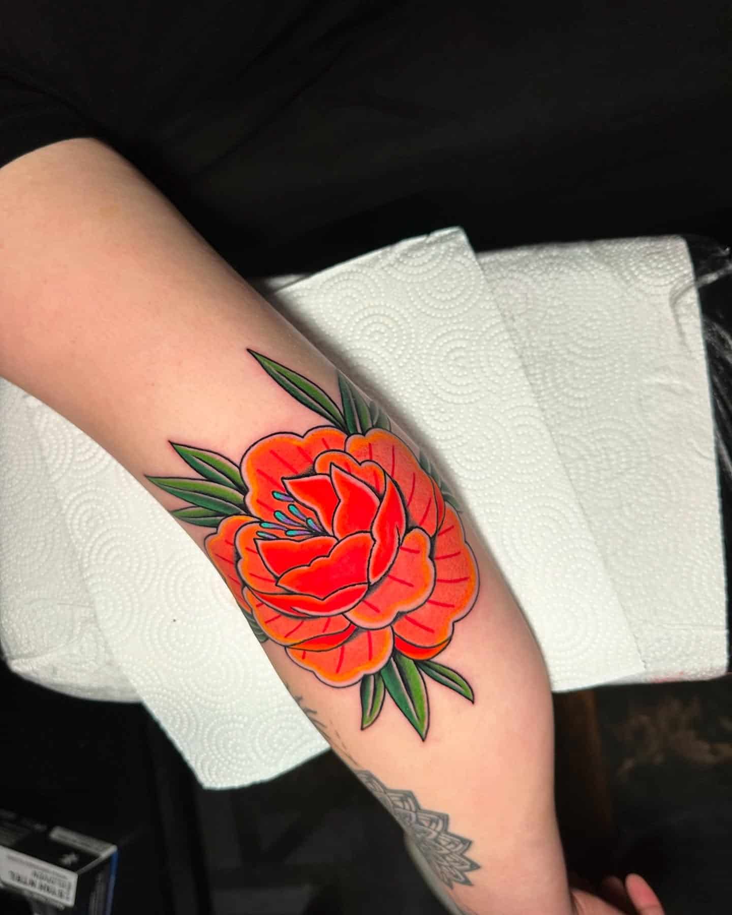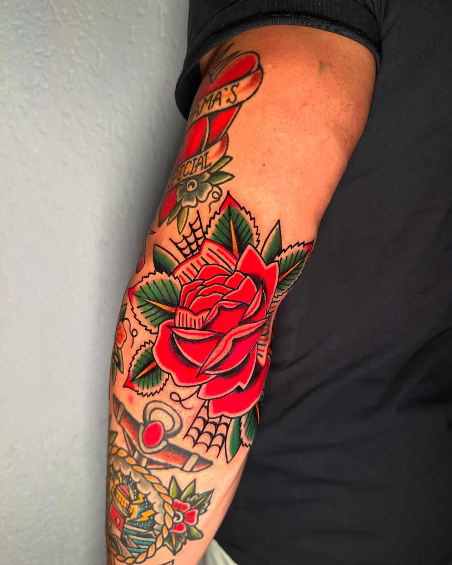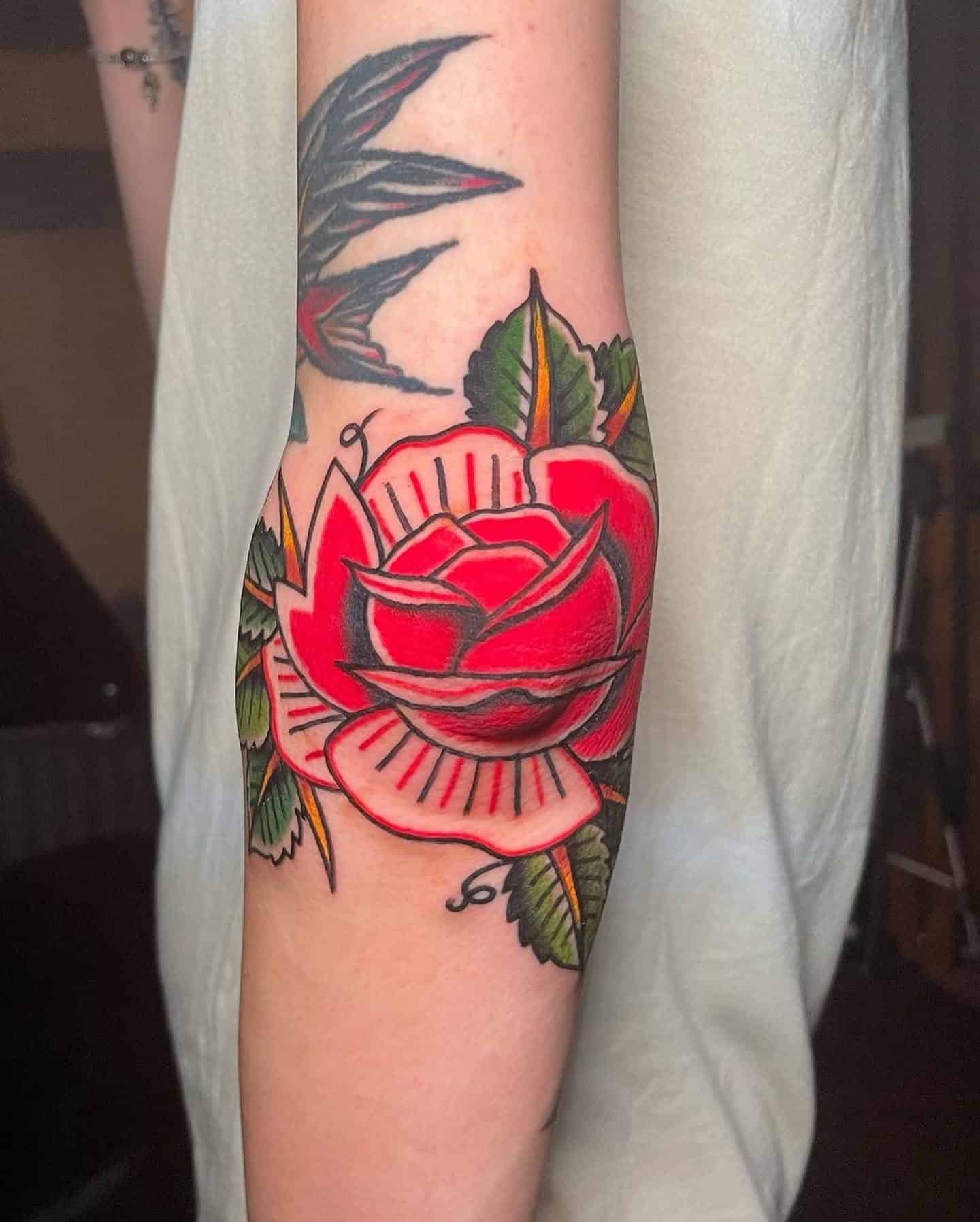 This is such a classic choice! The tattoo features a large, vibrant red rose surrounded by green leaves, and it’s displayed prominently on the elbow area.