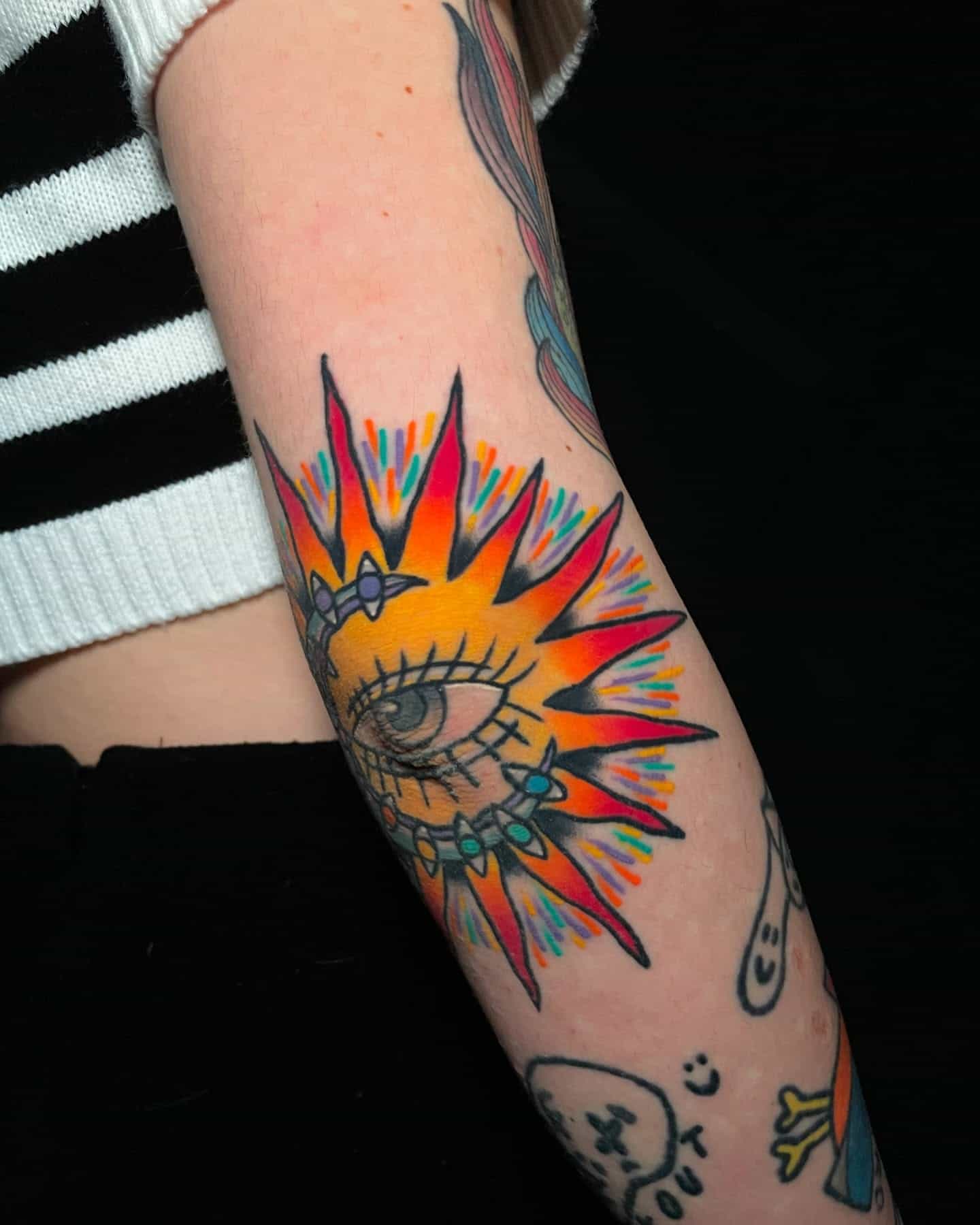 I love how bright this tattoo is. The vibrant sunburst design has an eye right at its center, and it’s surrounded by rays of bold colors like orange, red, and blue.