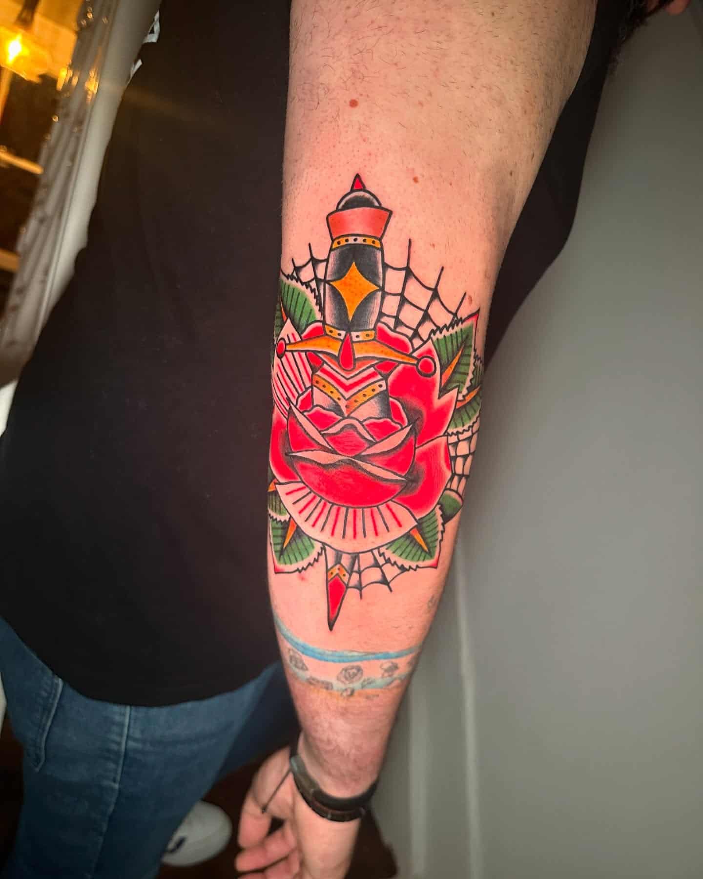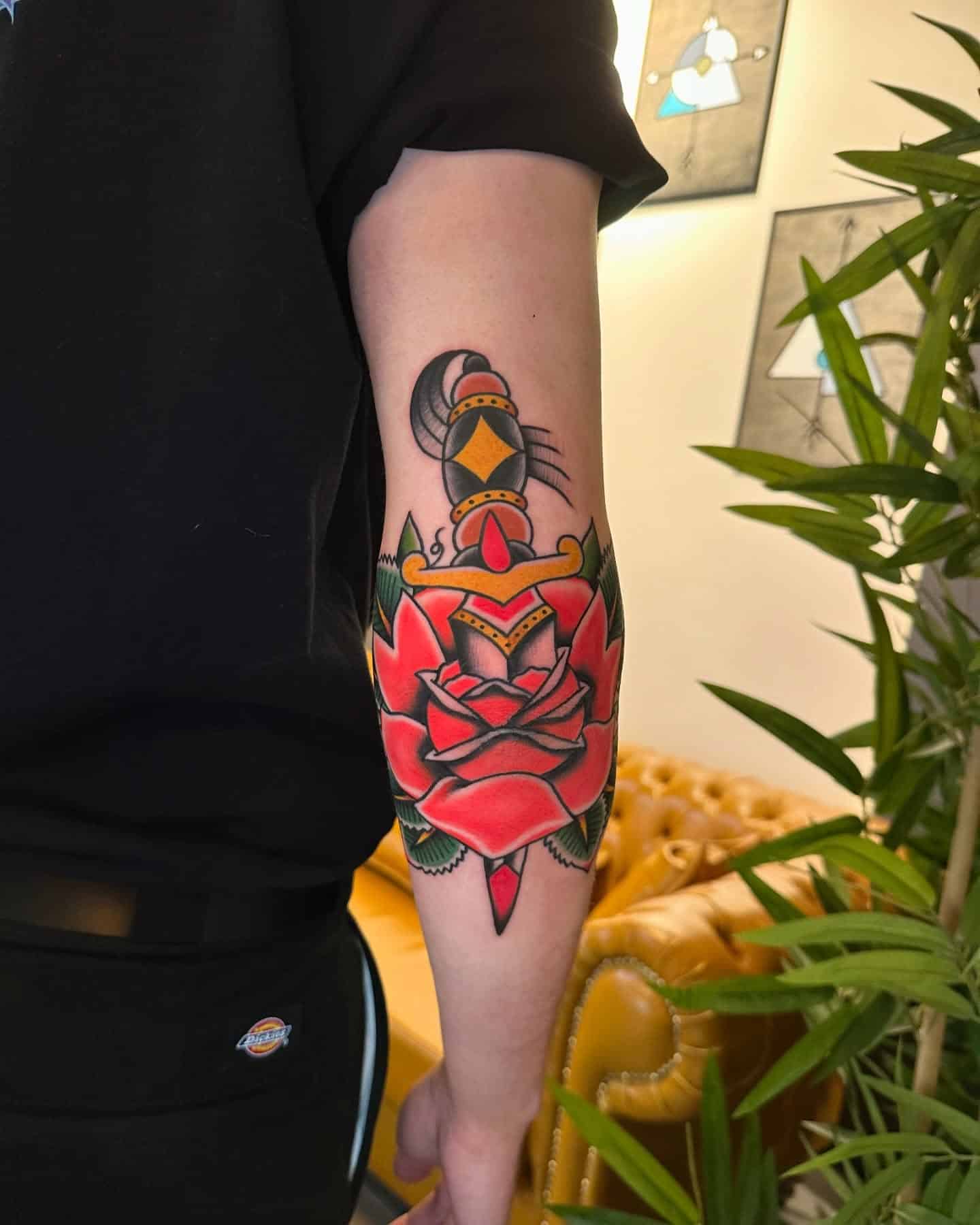 Obsessed with this one! The tattoo features a striking red flower that’s surrounded by intricate details, including a decorative sword and geometric shapes.