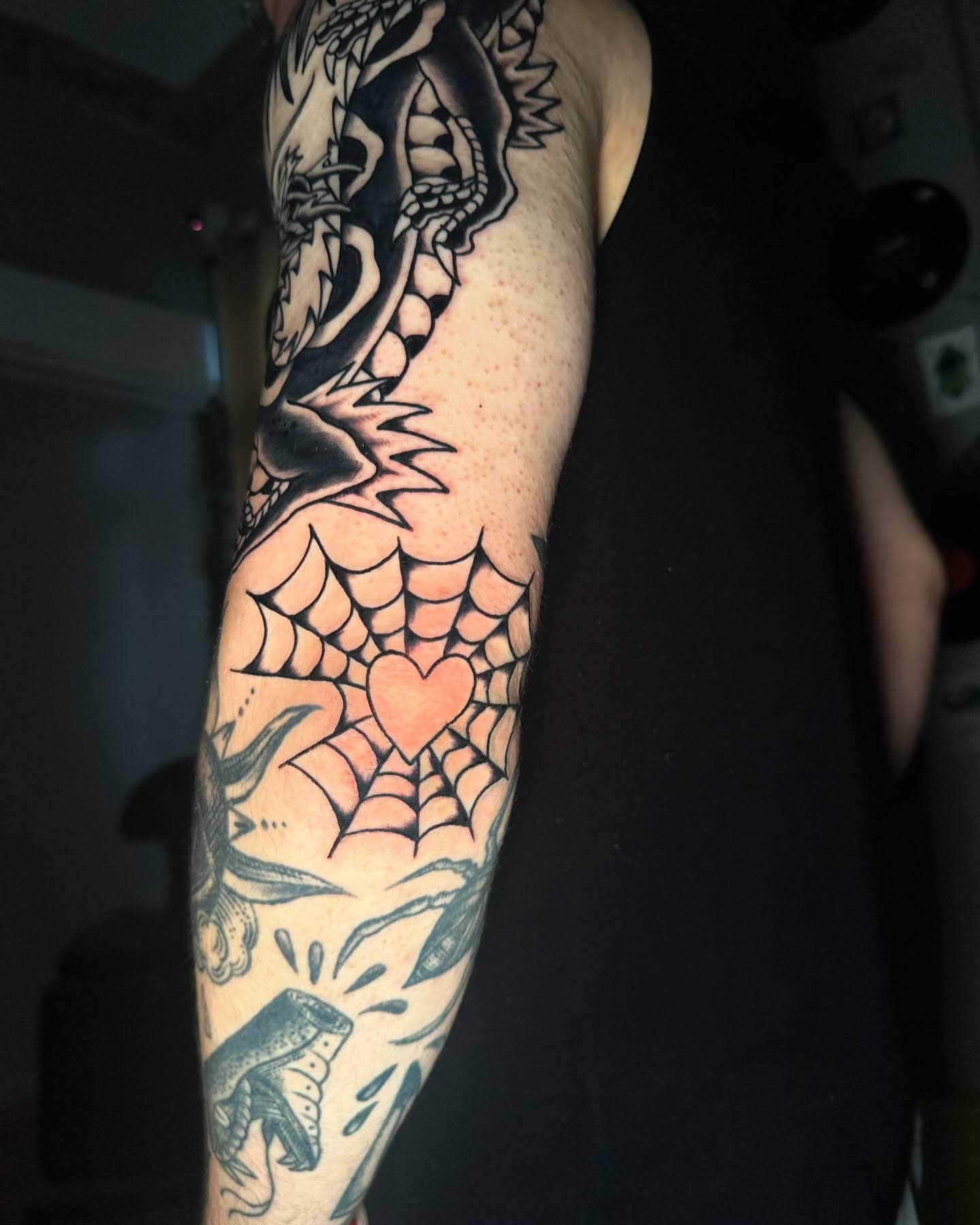 This tattoo has a prominent spiderweb with a heart right at its center, which creates such a striking focal point.