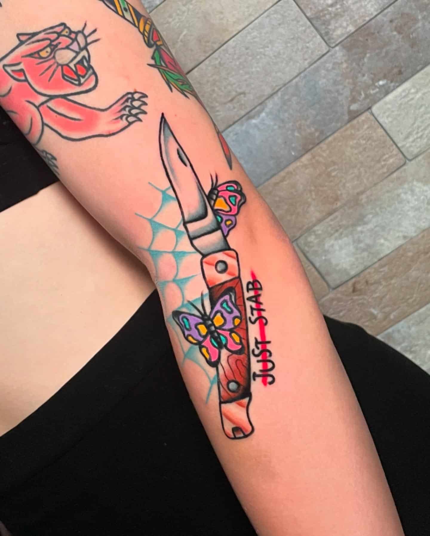 This tattoo is so cool! It features a striking knife design next to a colorful butterfly, and the visual contrast is just amazing.