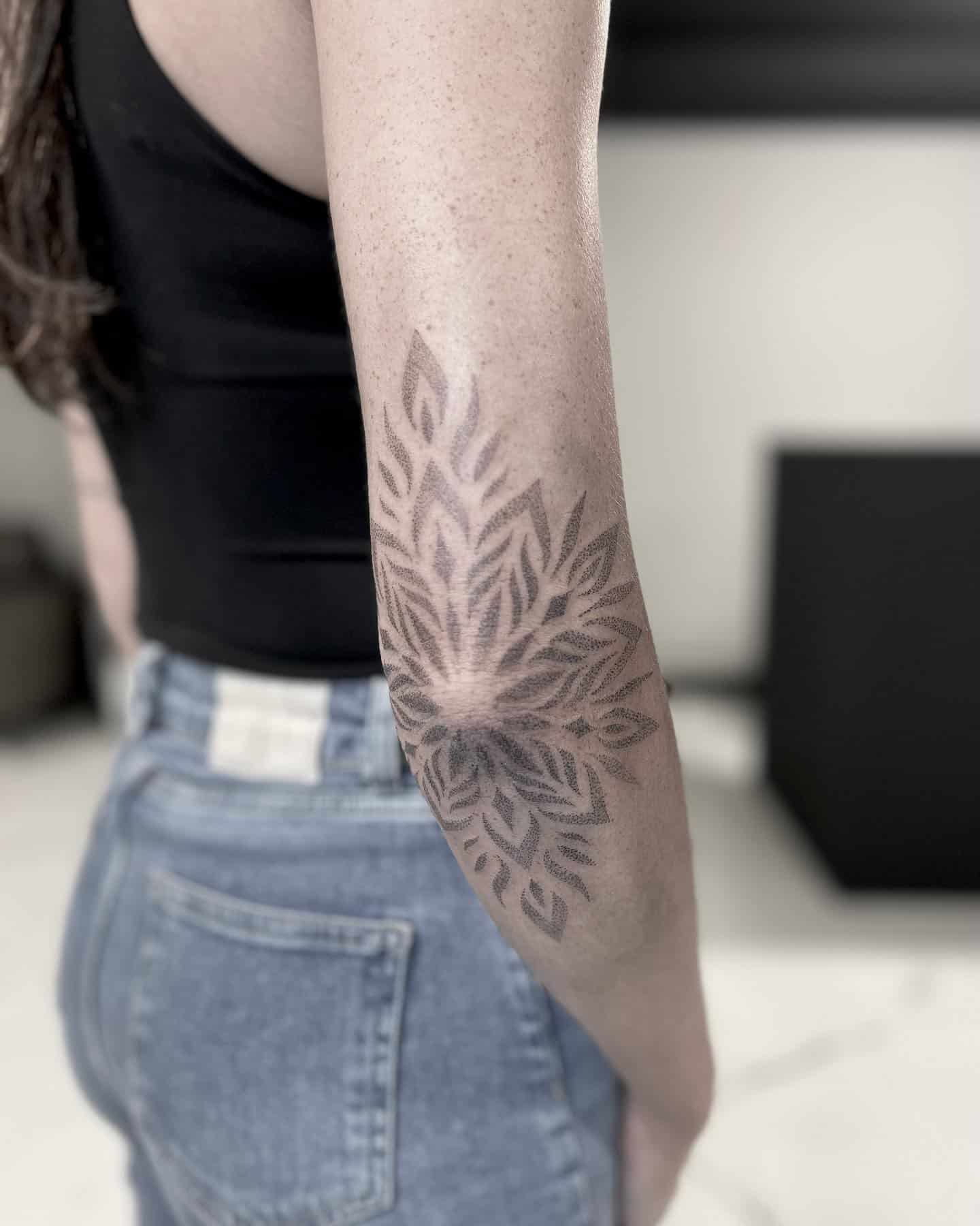 I am loving this delicate style. The tattoo has a detailed floral mandala that elegantly wraps around the elbow.