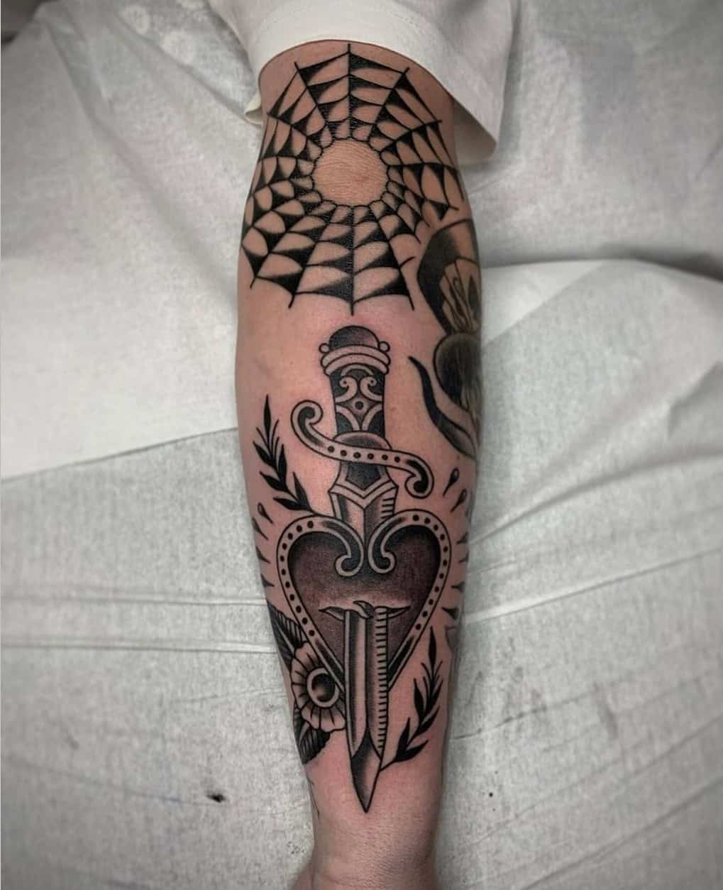 This tattoo features a striking heart and dagger design, and it’s complemented by an intricate spiderweb just above it.