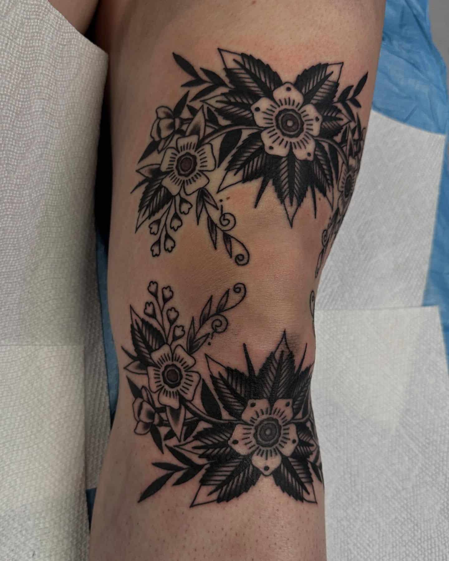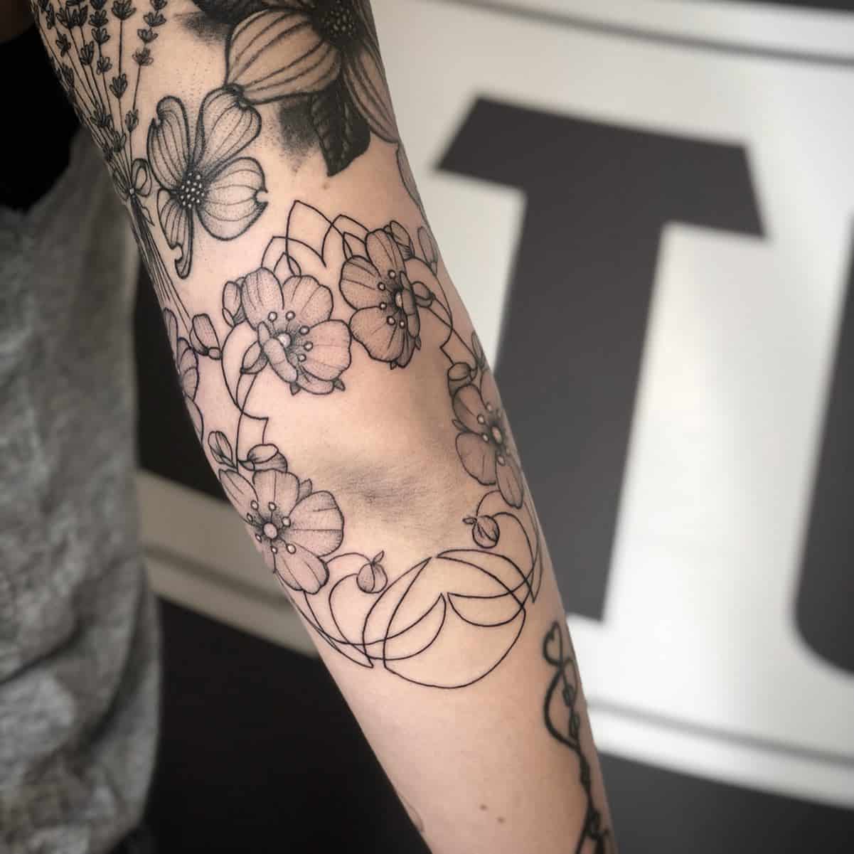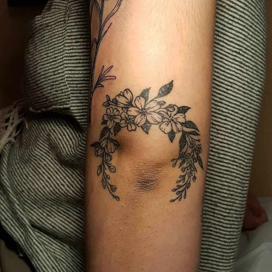 This tattoo is all about the details. It features an intricate floral design that wraps around the elbow, showcasing some really detailed line work and shading.