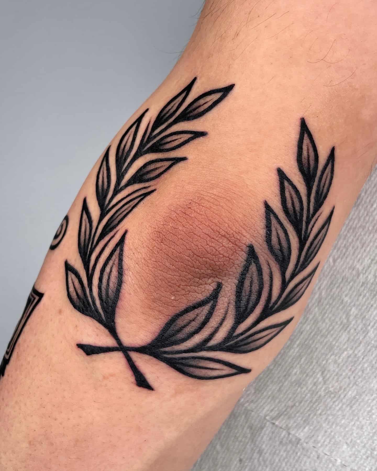 A striking leafy wreath design wraps around the elbow in this piece, and it features detailed black outlines and shading.