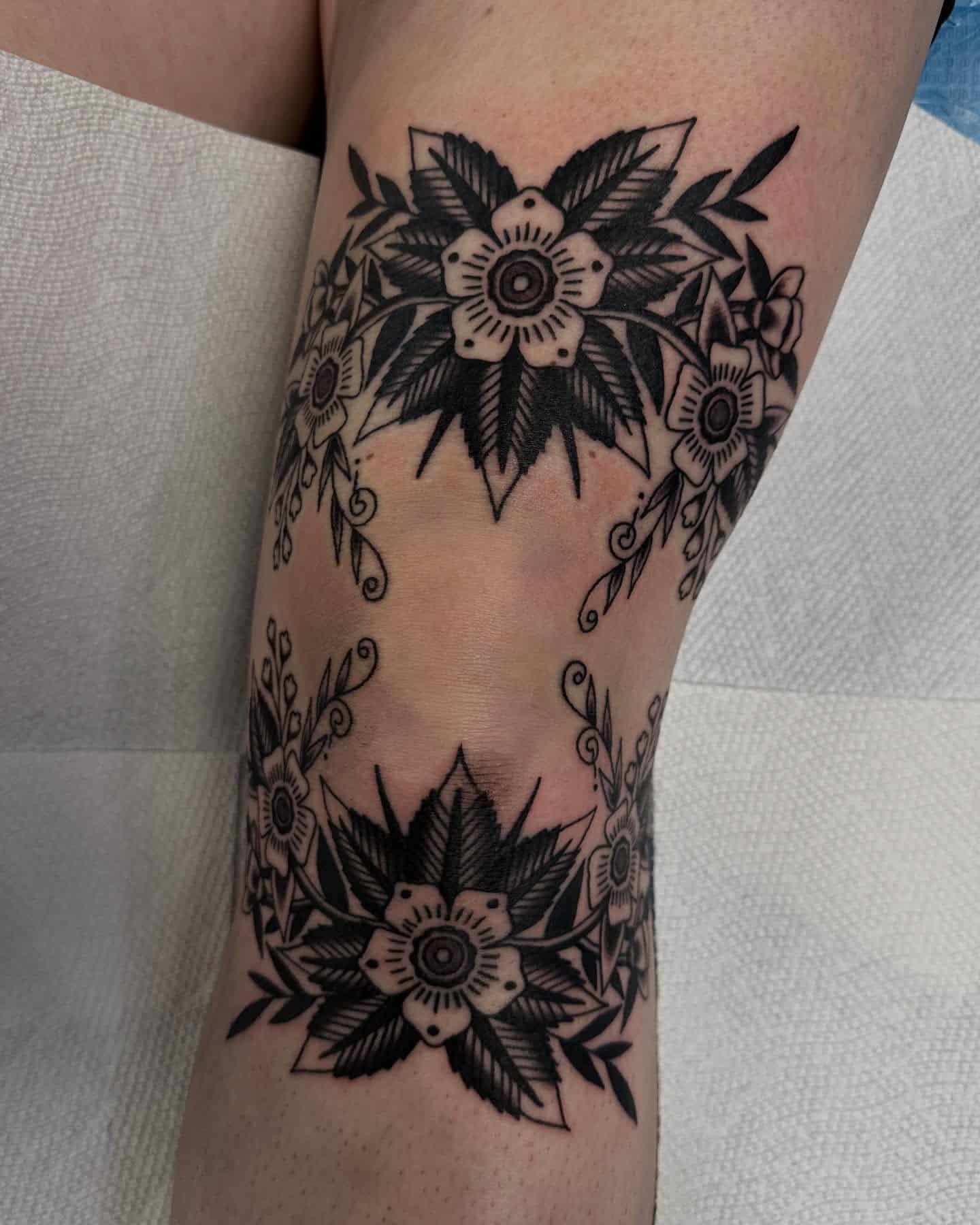 I’ve been loving this kind of delicate look lately. The tattoo features a floral wreath that elegantly wraps around the elbow.