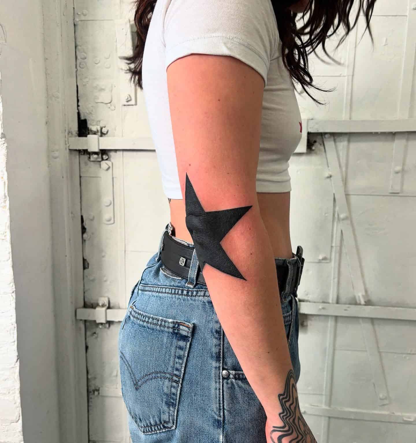 Sometimes a simple design makes the biggest impact. The tattoo features a large, solid black star that wraps right around the elbow, creating a really striking visual effect.