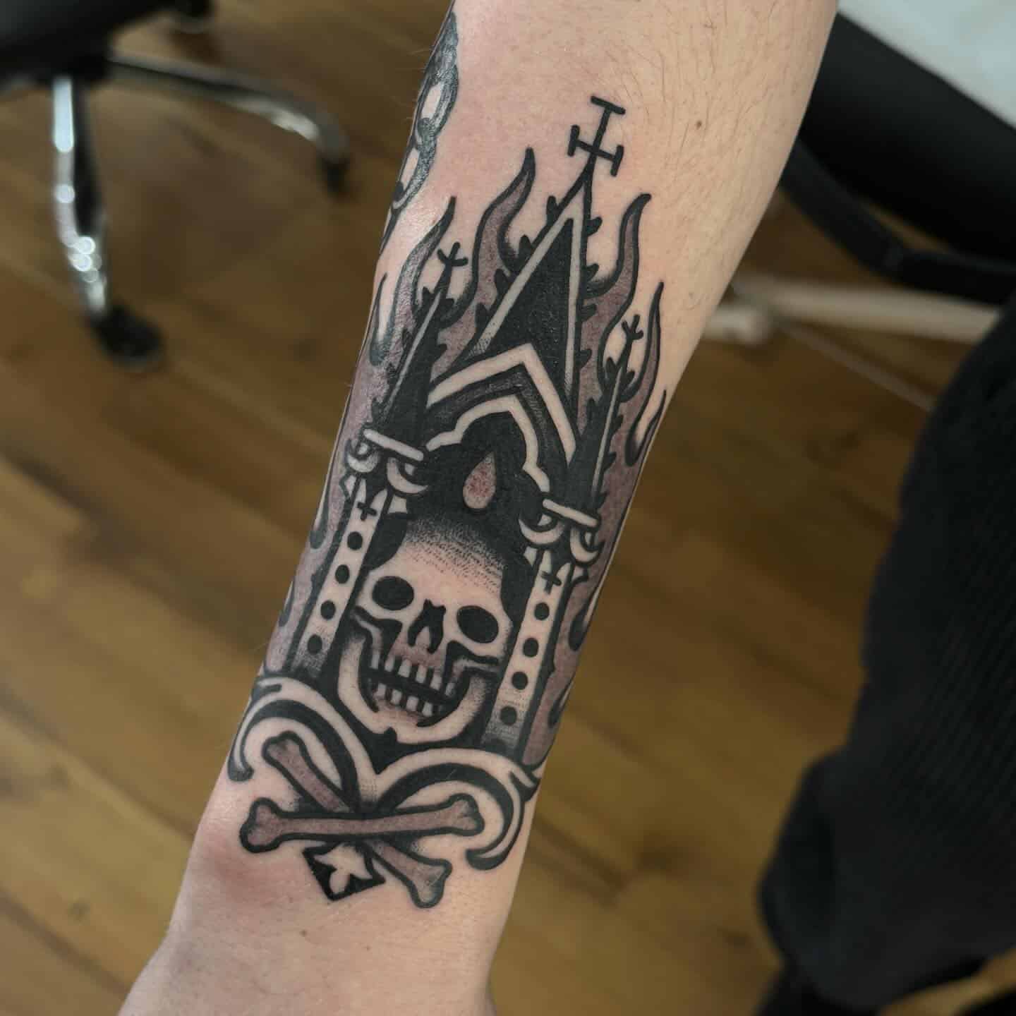 Okay, how amazing is this piece? The tattoo features a striking skull that’s framed by intricate gothic architecture, complete with pointed arches and flames.