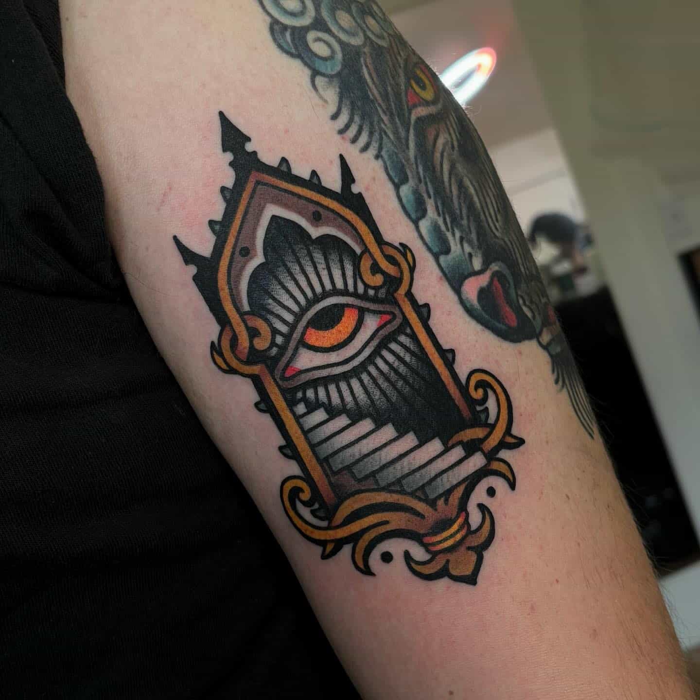This tattoo is so eye-catching! It features a striking eye that’s enclosed in an ornate arch, and it combines bold lines with rich colors.