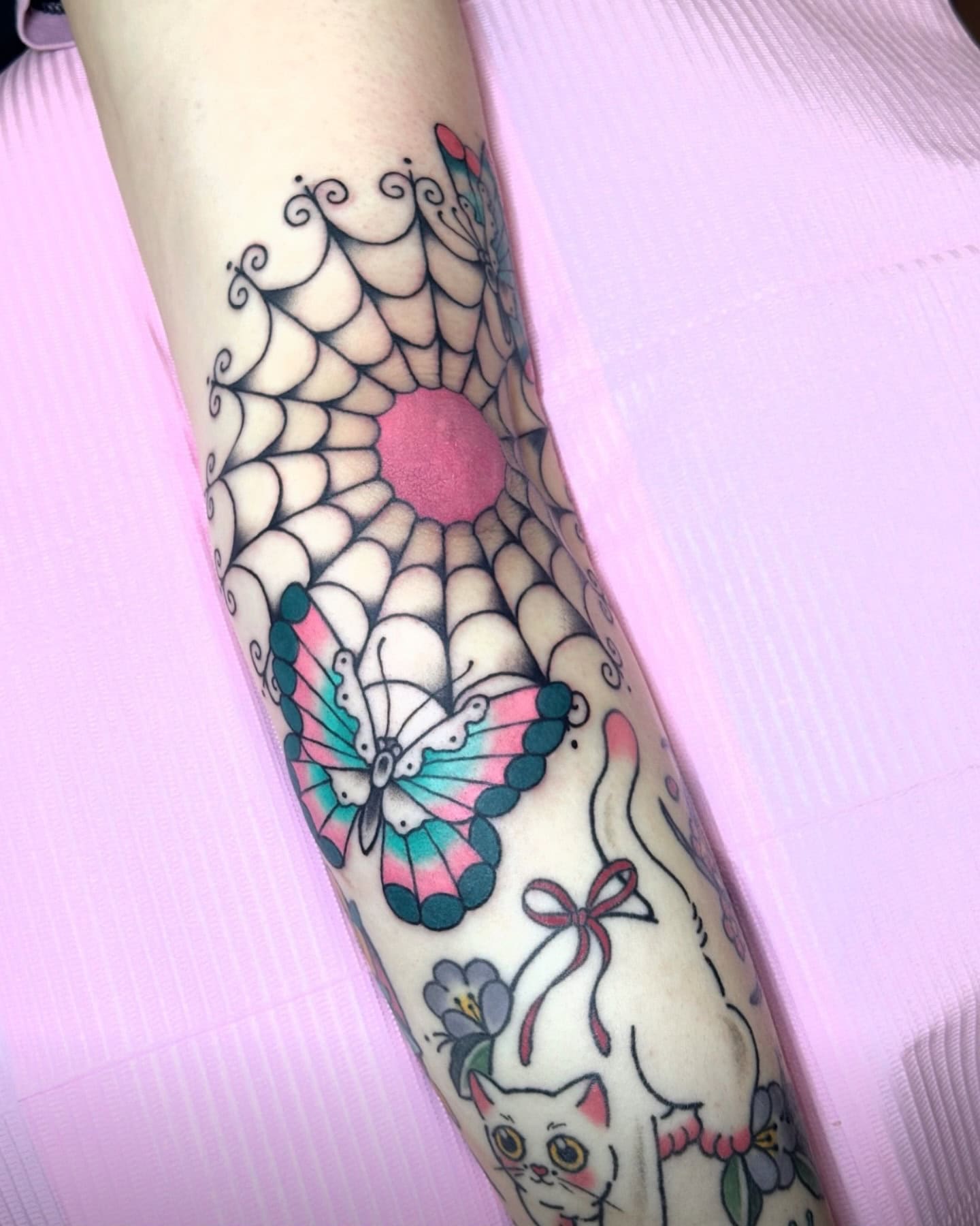 This tattoo is so much fun. It features a detailed spiderweb design that surrounds a vibrant pink center, creating a striking focal point.