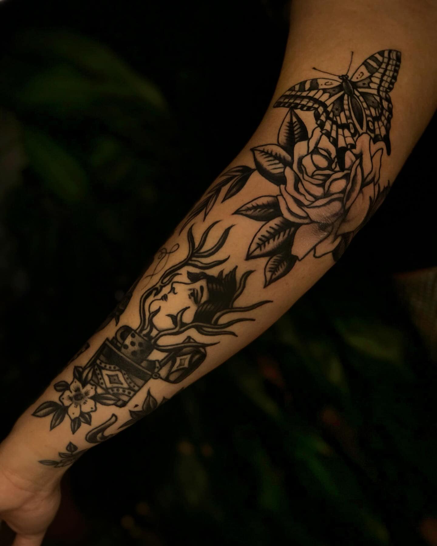 This tattoo is so pretty. It features intricate designs of roses and a butterfly, and it creates a lively scene that wraps all the way around the elbow.