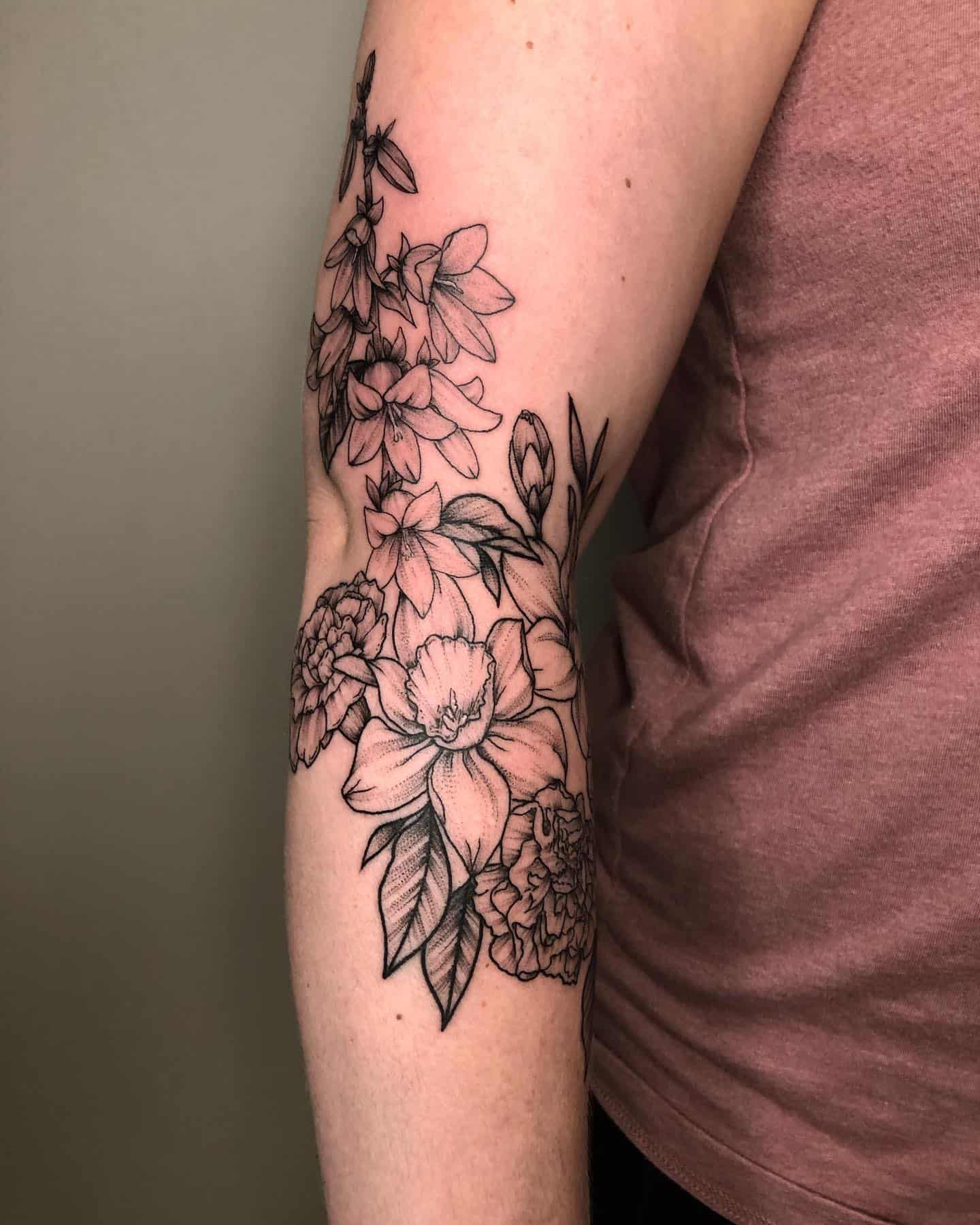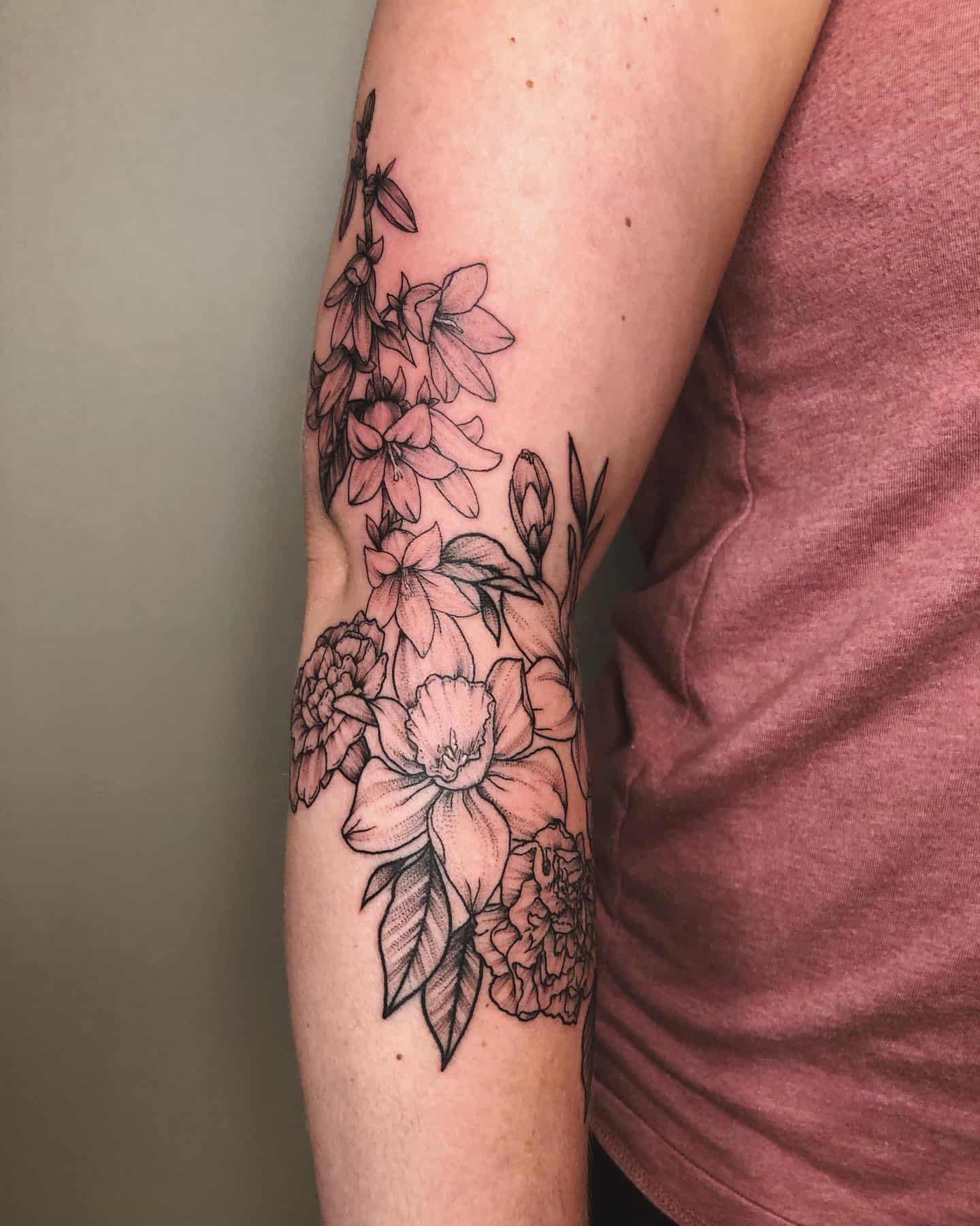 Each floral element is arranged so carefully to create a cohesive design that flows beautifully around the elbow area.