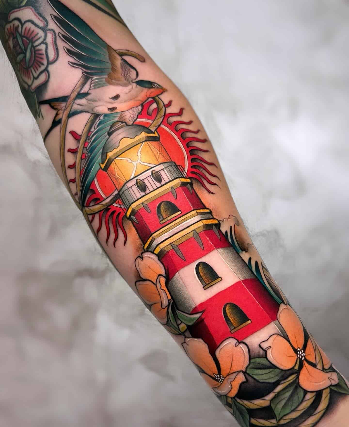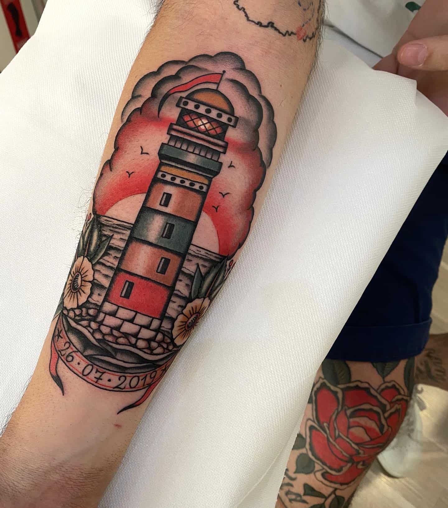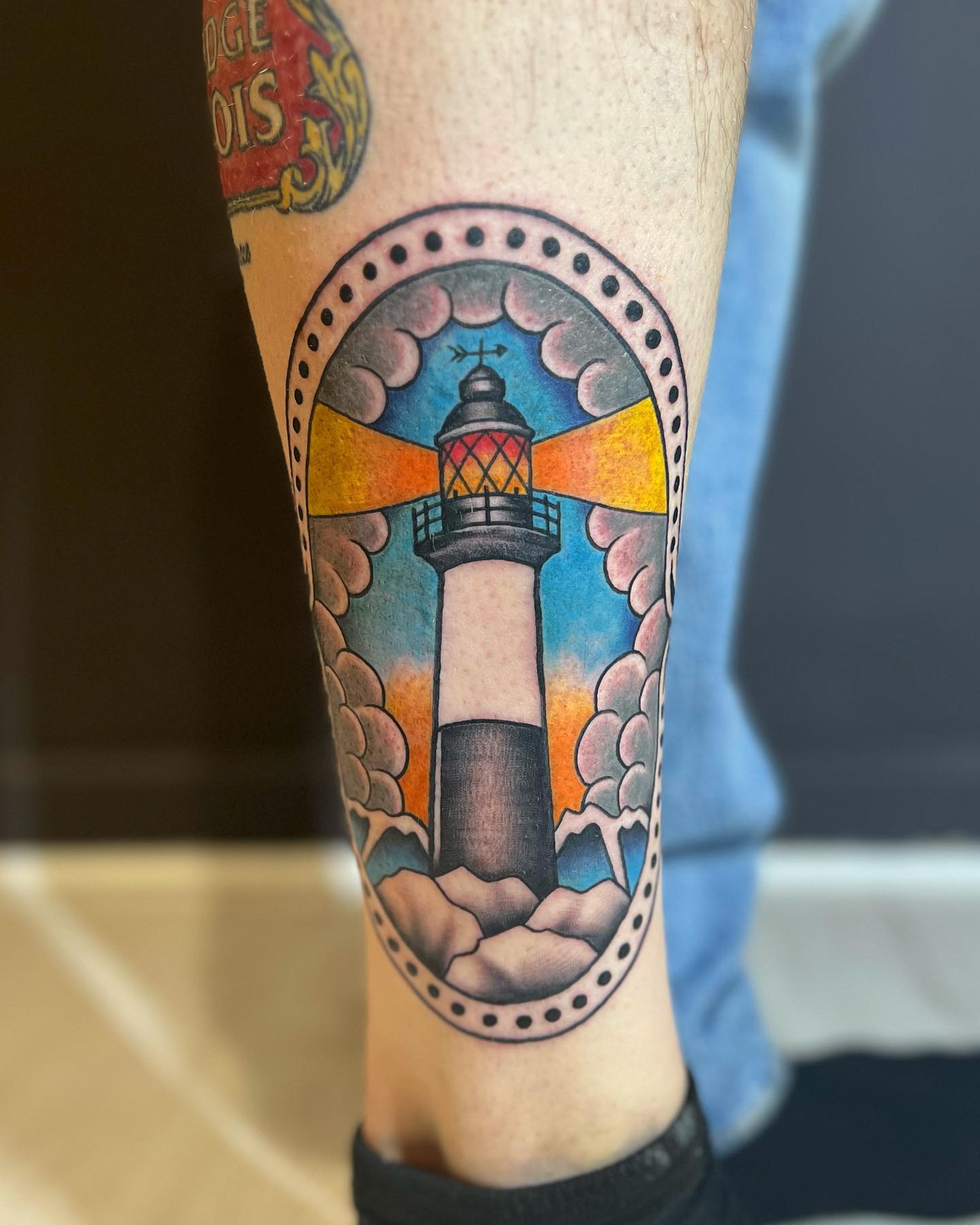 For a bit of a classic, old-school feel, this one is amazing. The tattoo has a colorful lighthouse set against a vivid sunset backdrop, with clouds enhancing the whole scene.