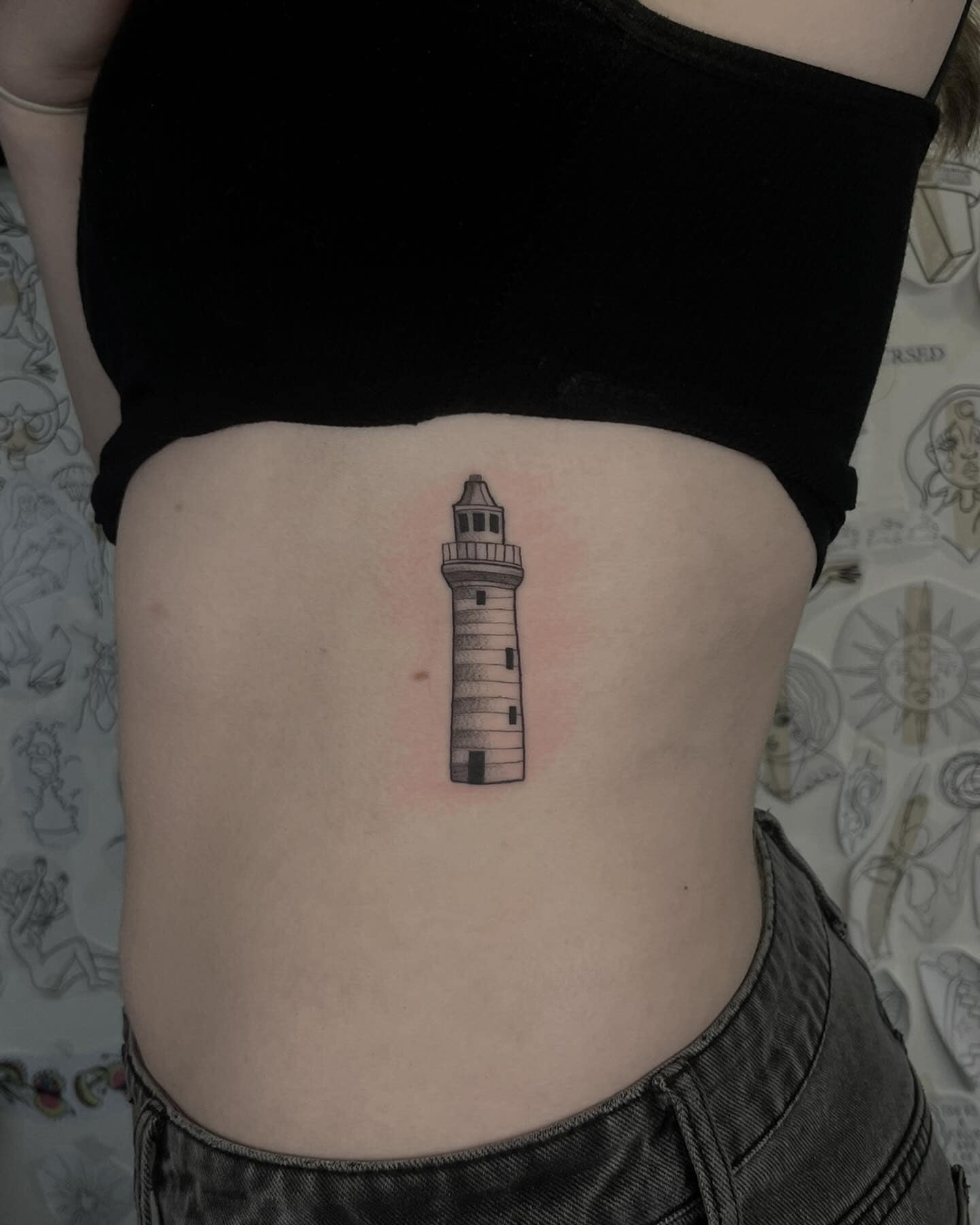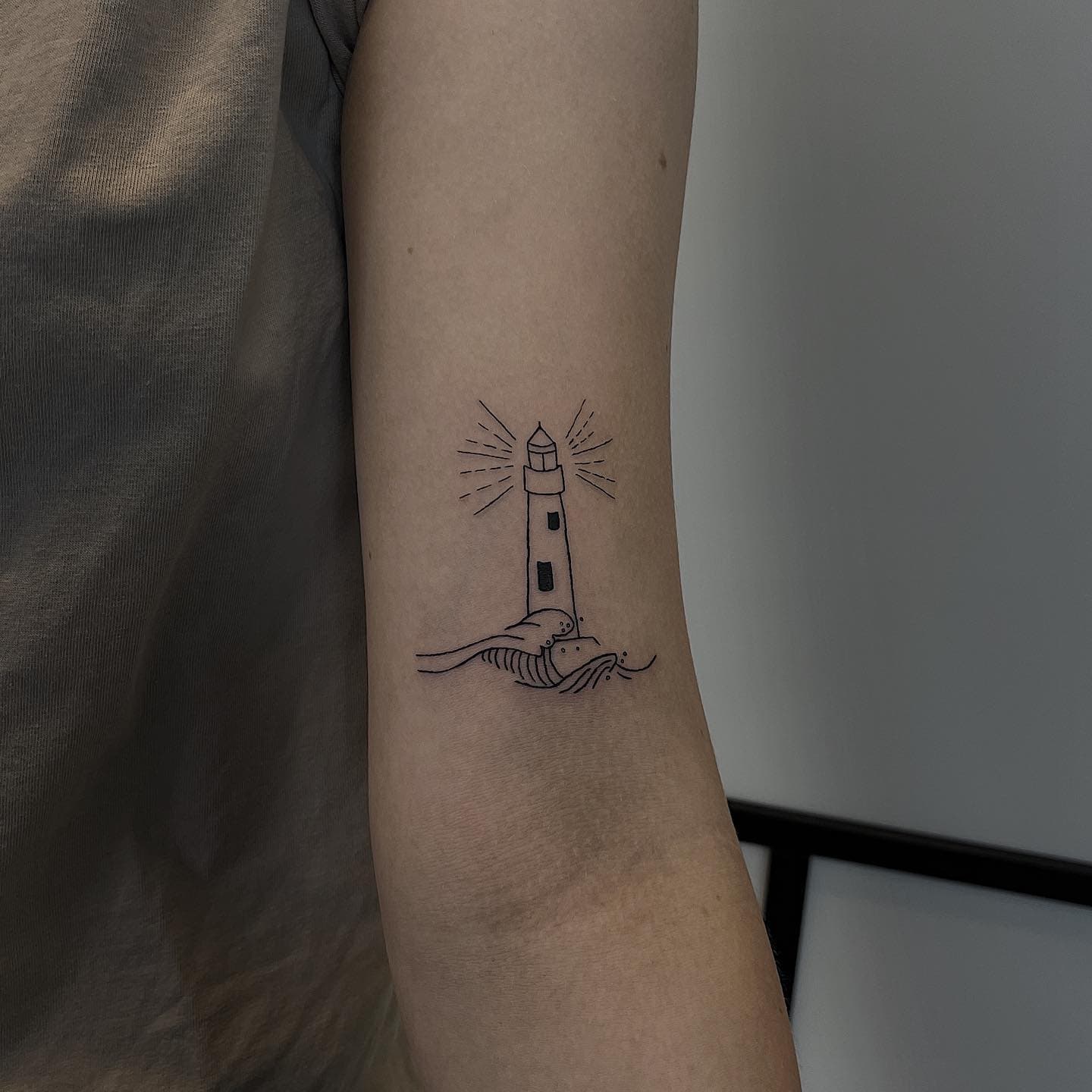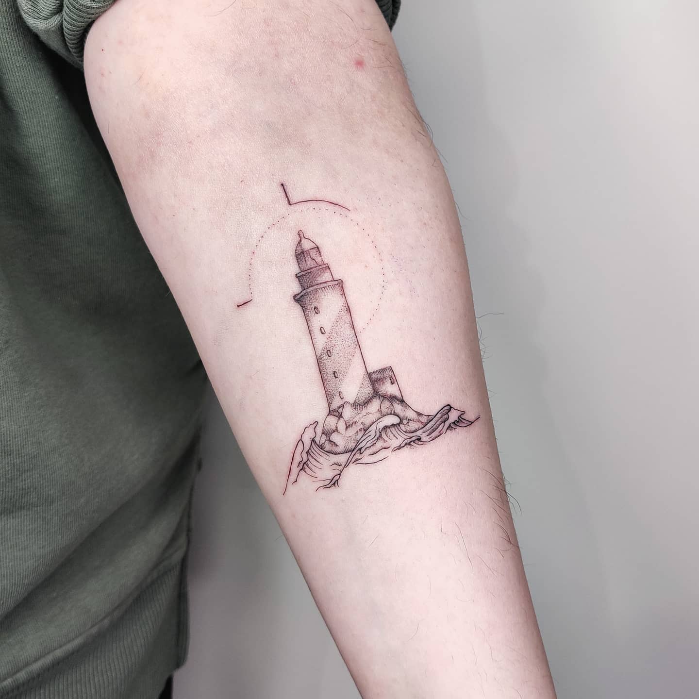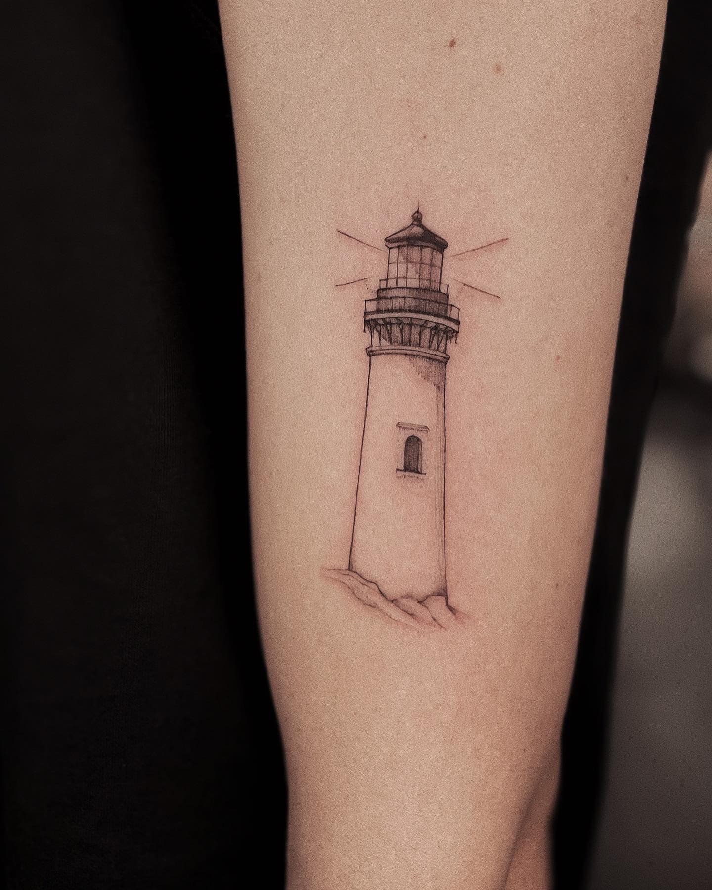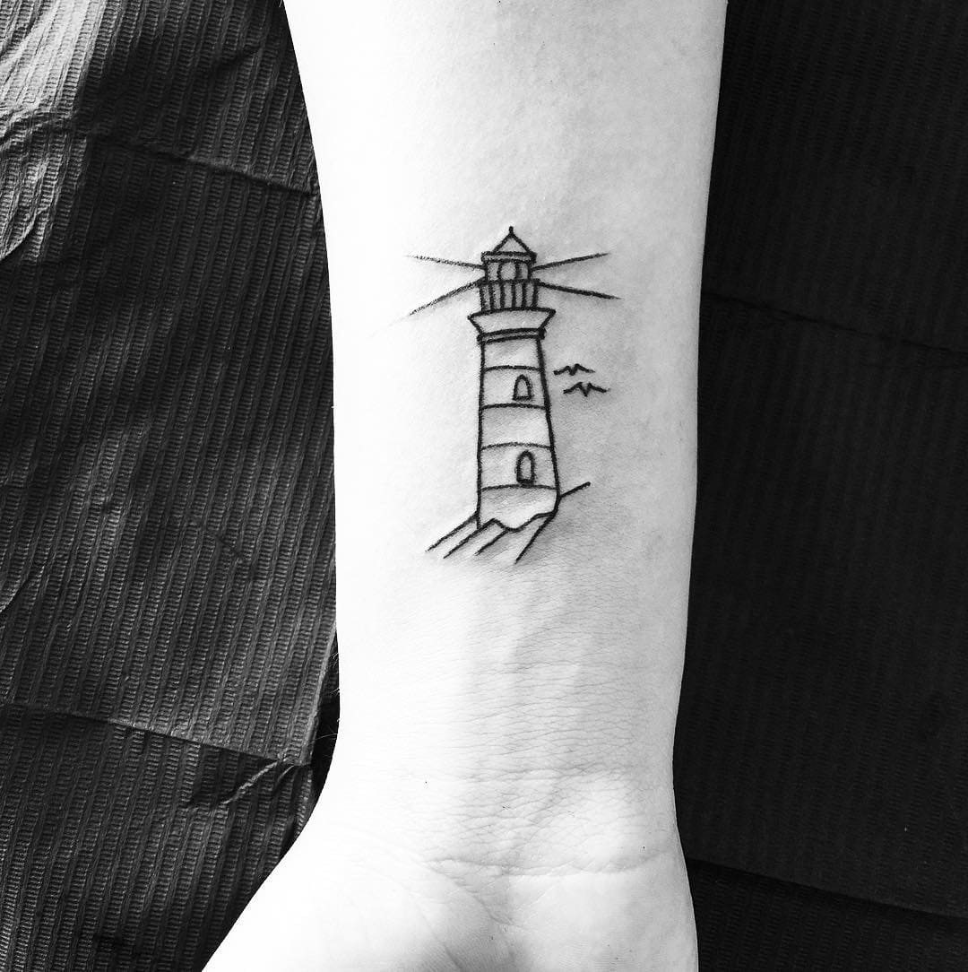 This tattoo is a perfect example of simple but effective. It features a minimalist lighthouse, standing tall with clean lines and some subtle detailing.