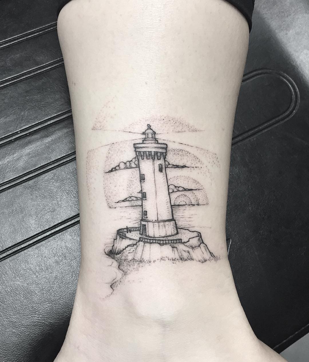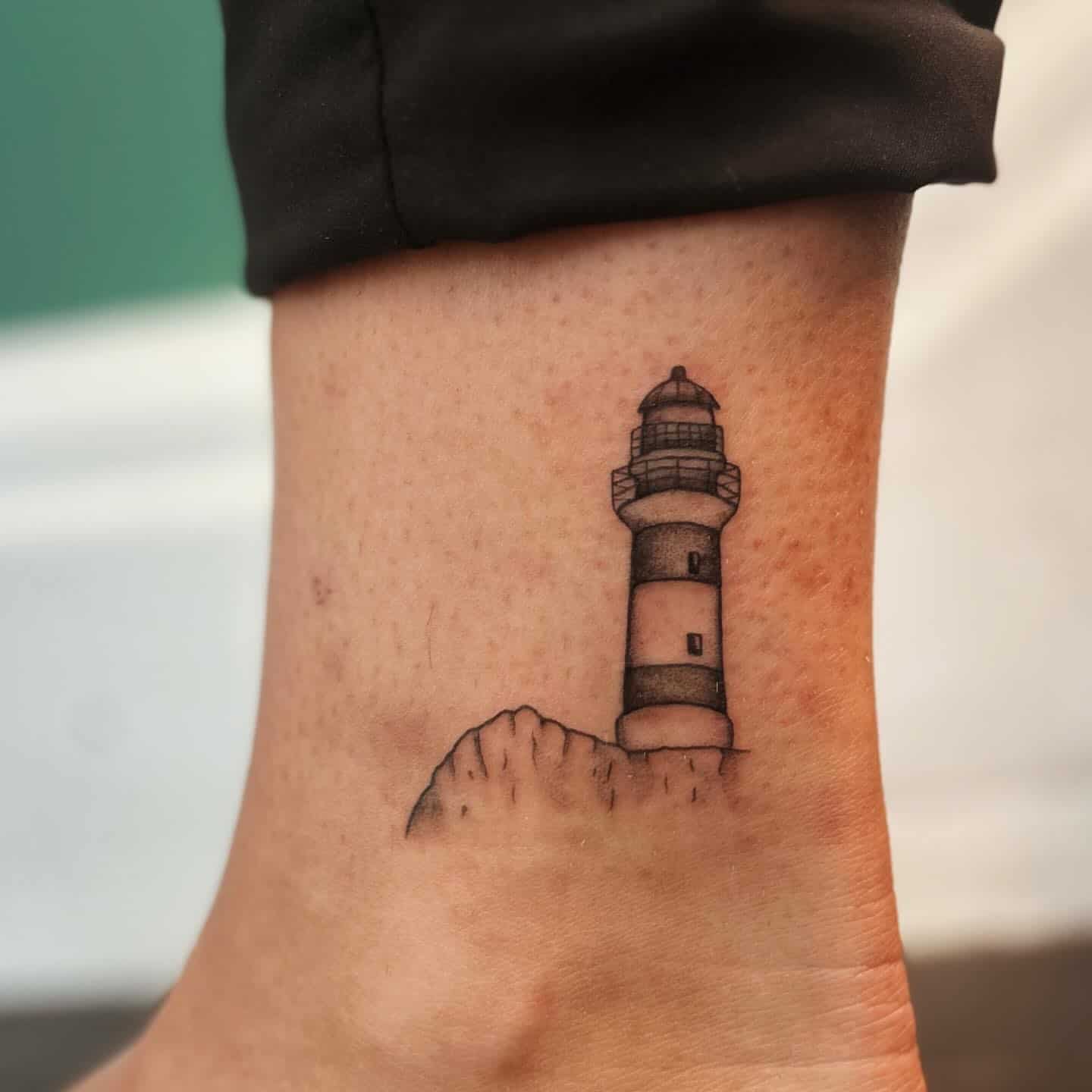 Ankle tattoos are always so chic, and this one is no exception. This piece features a detailed lighthouse standing on top of a rocky base, showcasing really clear lines and shading.