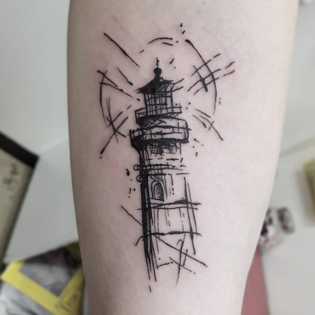 For something a little different, check out this abstract piece. The tattoo has a detailed lighthouse design surrounded by abstract lines that give it a sense of movement.