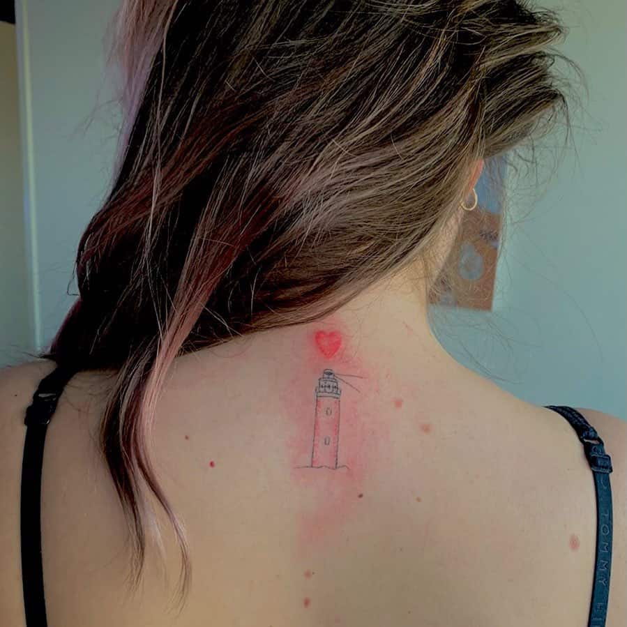 How cute is this one? The tattoo features a minimalist lighthouse design with a small heart right above it. This combination creates such a charming visual that emphasizes the lighthouse’s significance, maybe representing guidance and love.