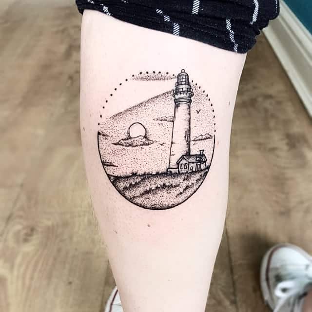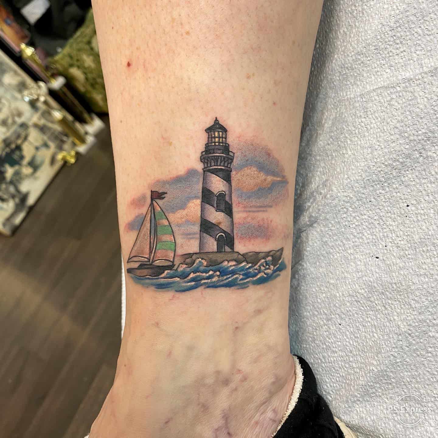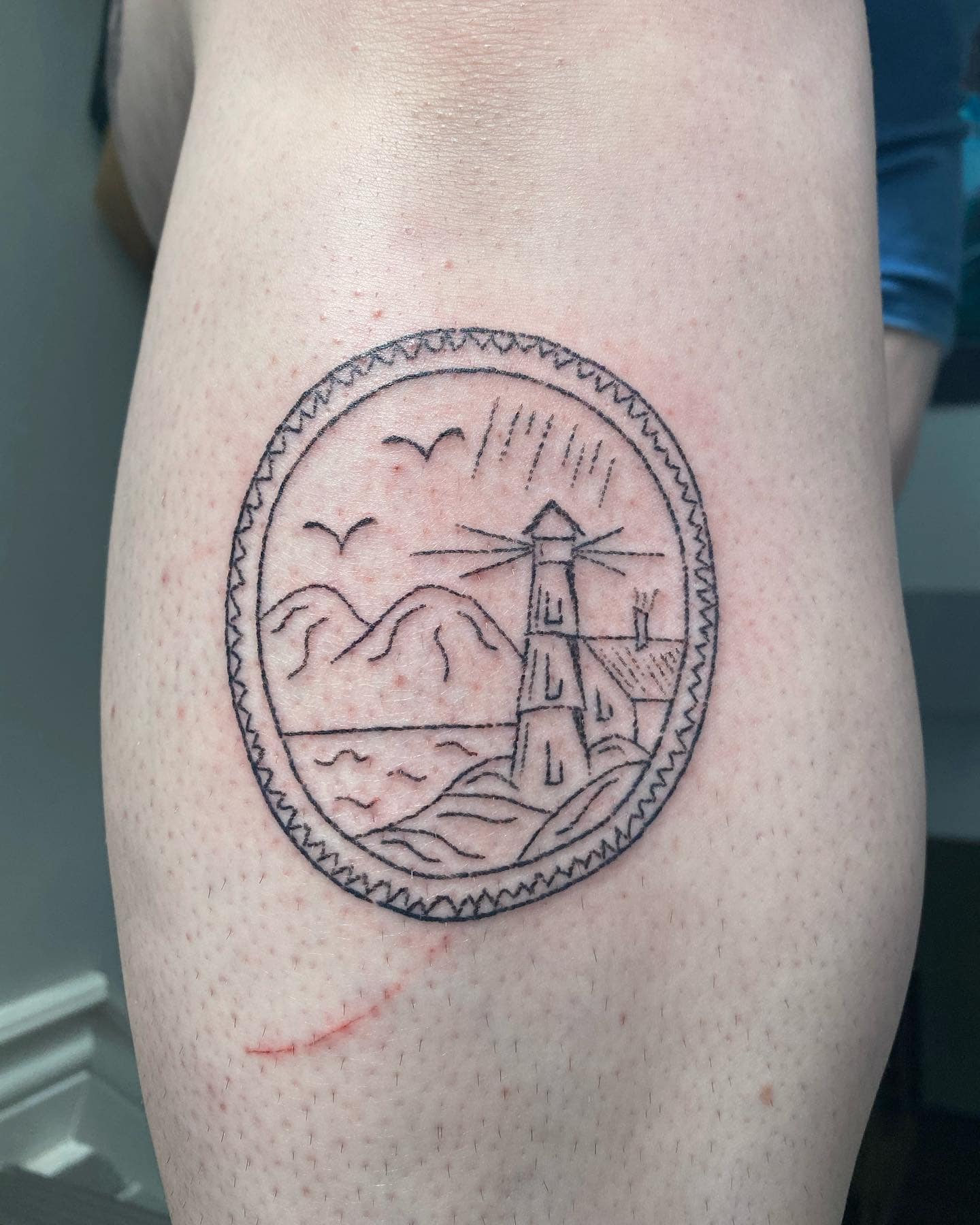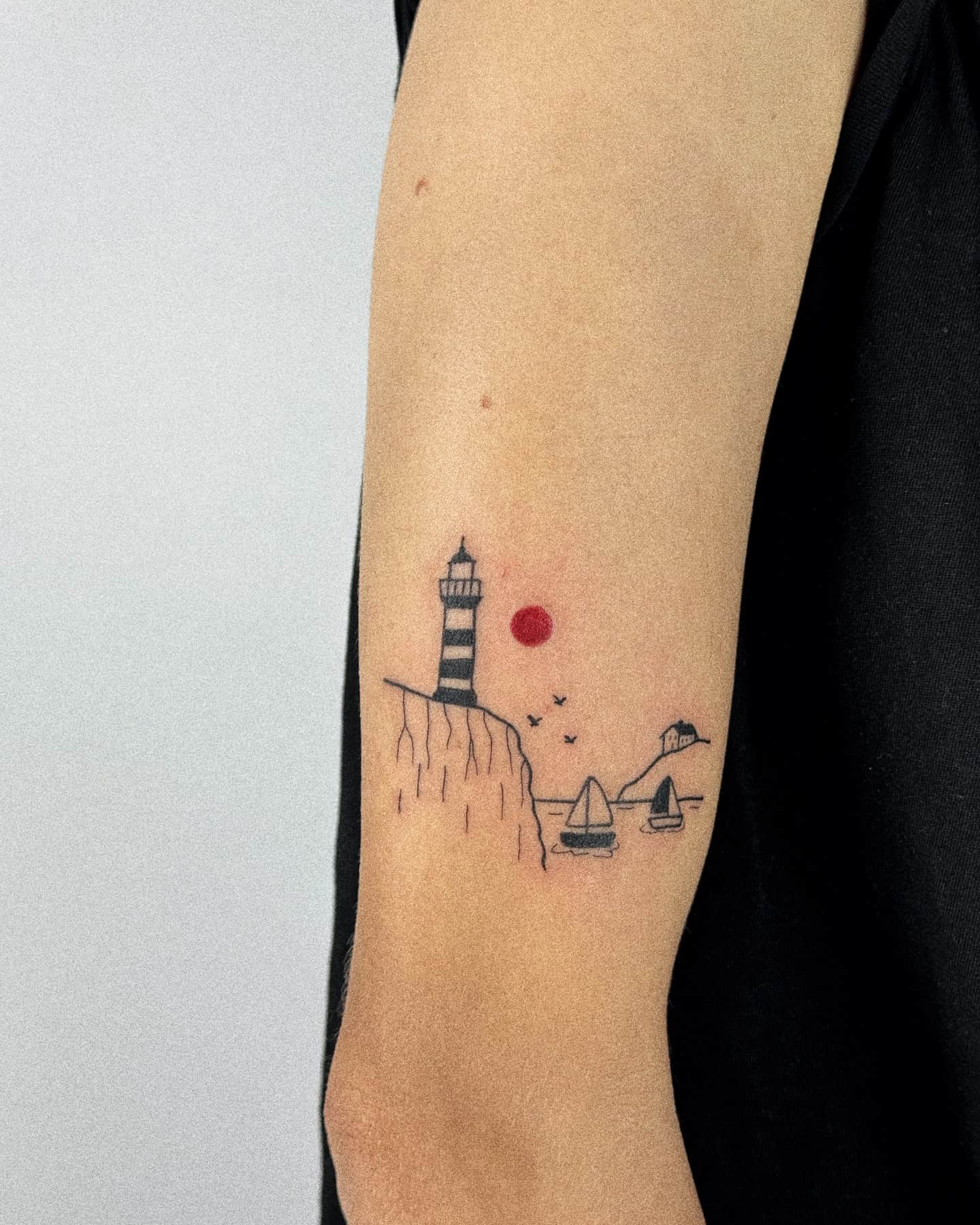 There’s so much to love in this little scene. The tattoo shows a lighthouse standing prominently next to a small house and a sailboat in the background.