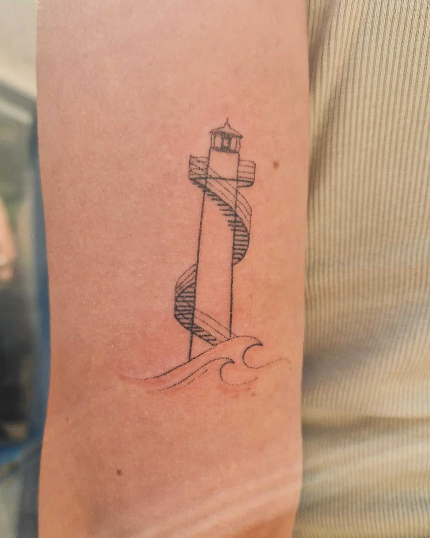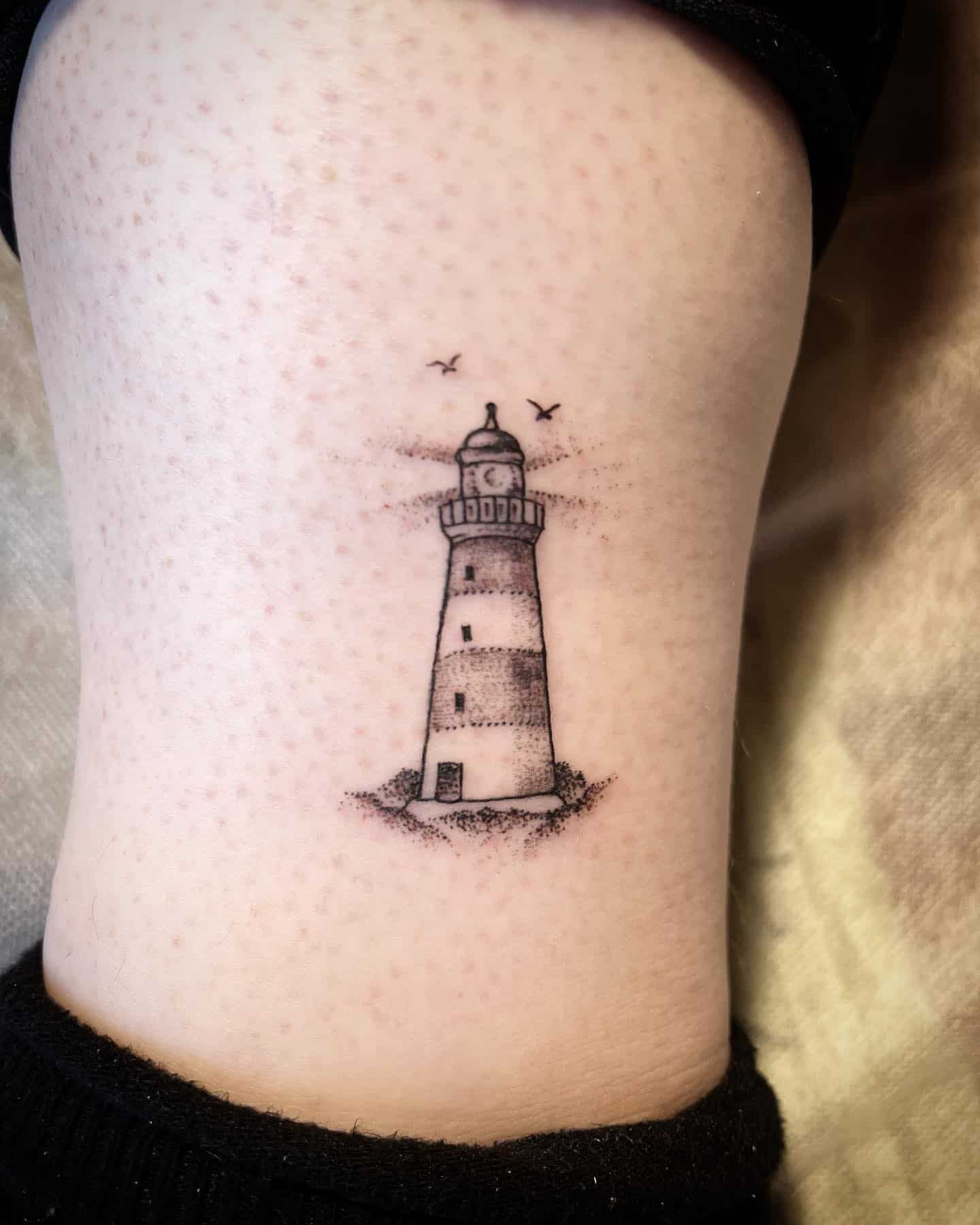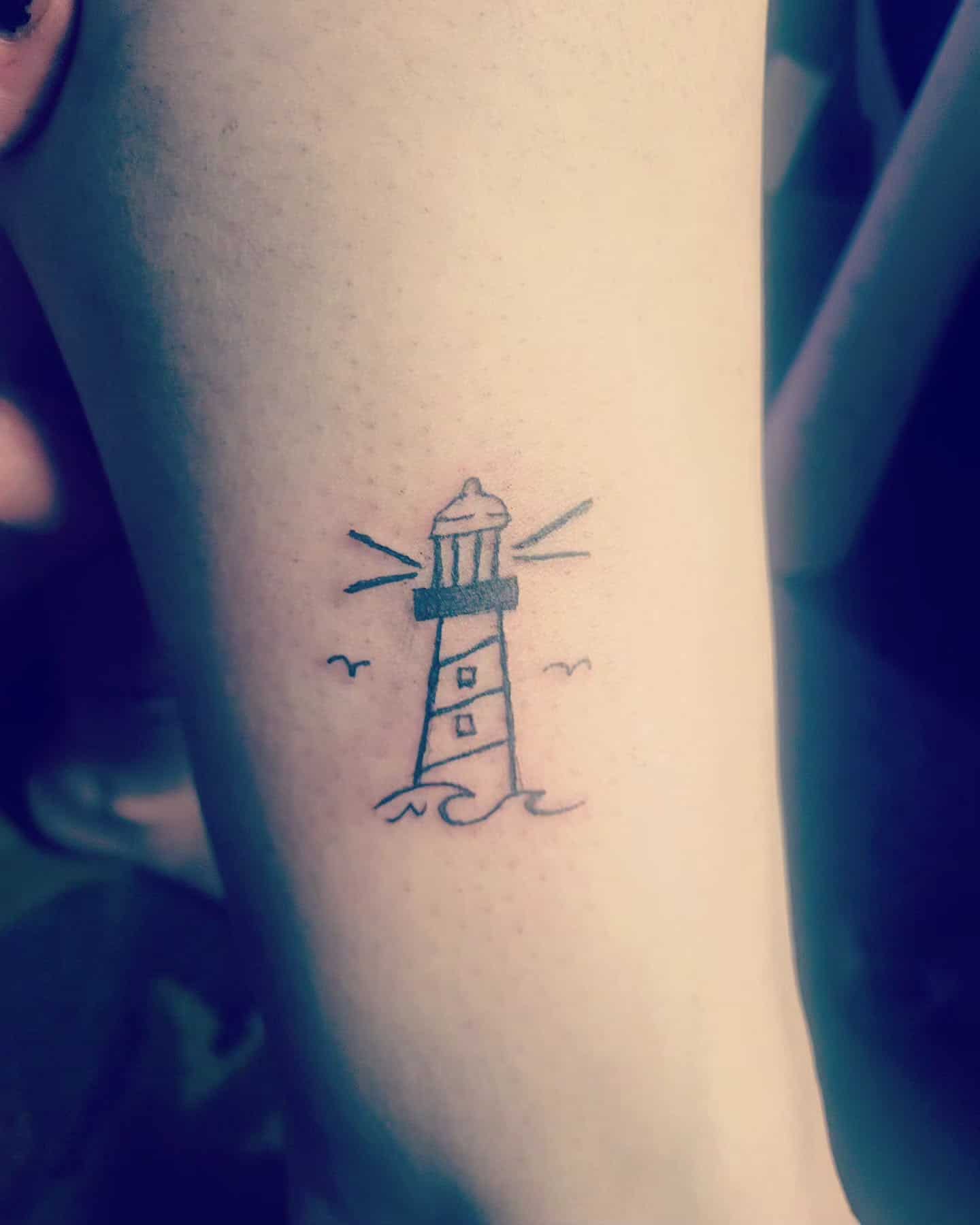 Another great minimalist option! This tattoo has a simple yet striking lighthouse surrounded by gentle waves and small birds.