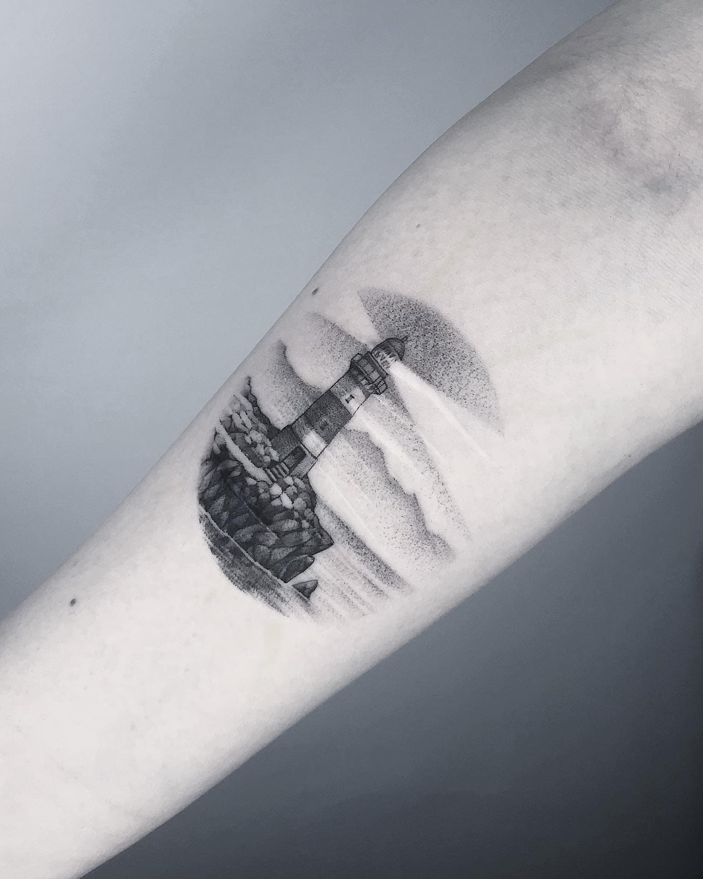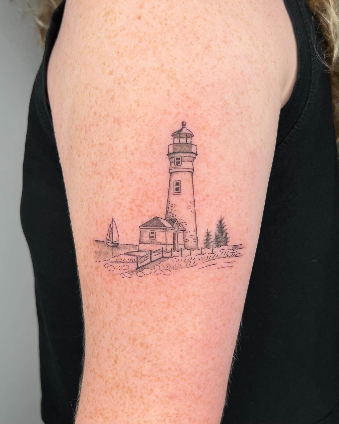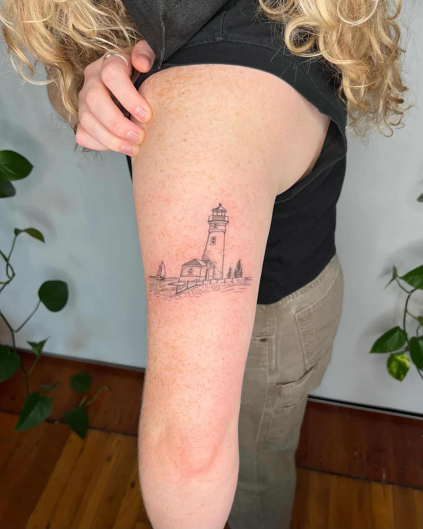 I’m a big fan of tattoos that create a whole scene. This one has a detailed lighthouse surrounded by a serene landscape, complete with a small building and a sailboat.