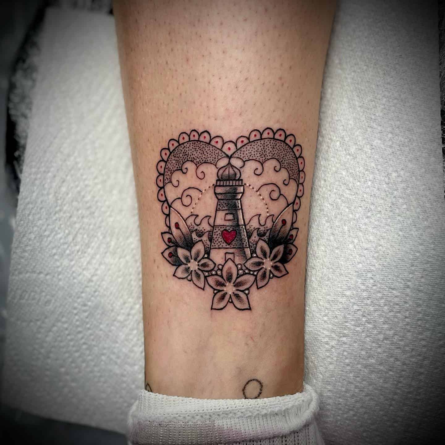 I love the frame on this one. The tattoo features a lighthouse framed by a heart shape, surrounded by stylized waves and floral elements.