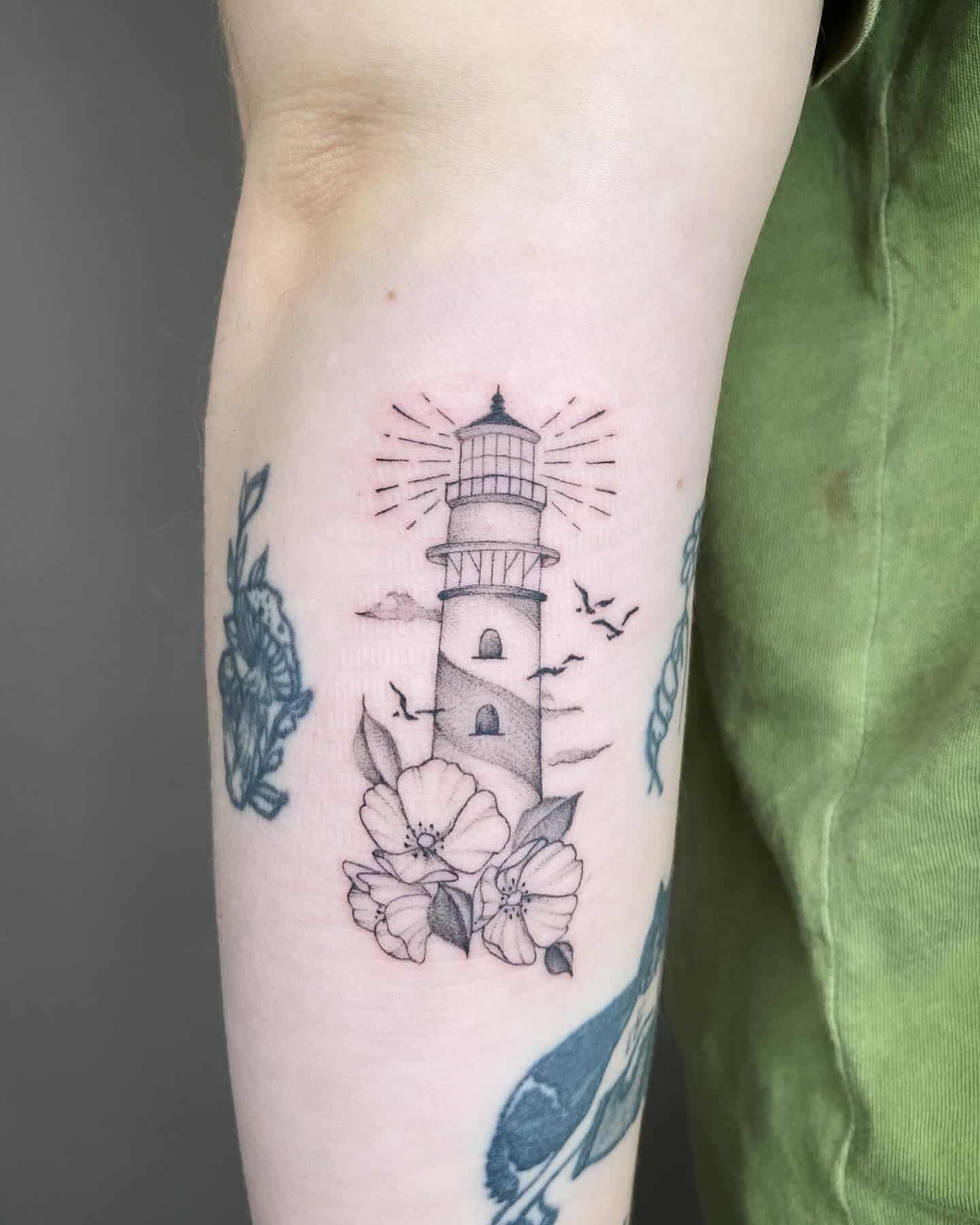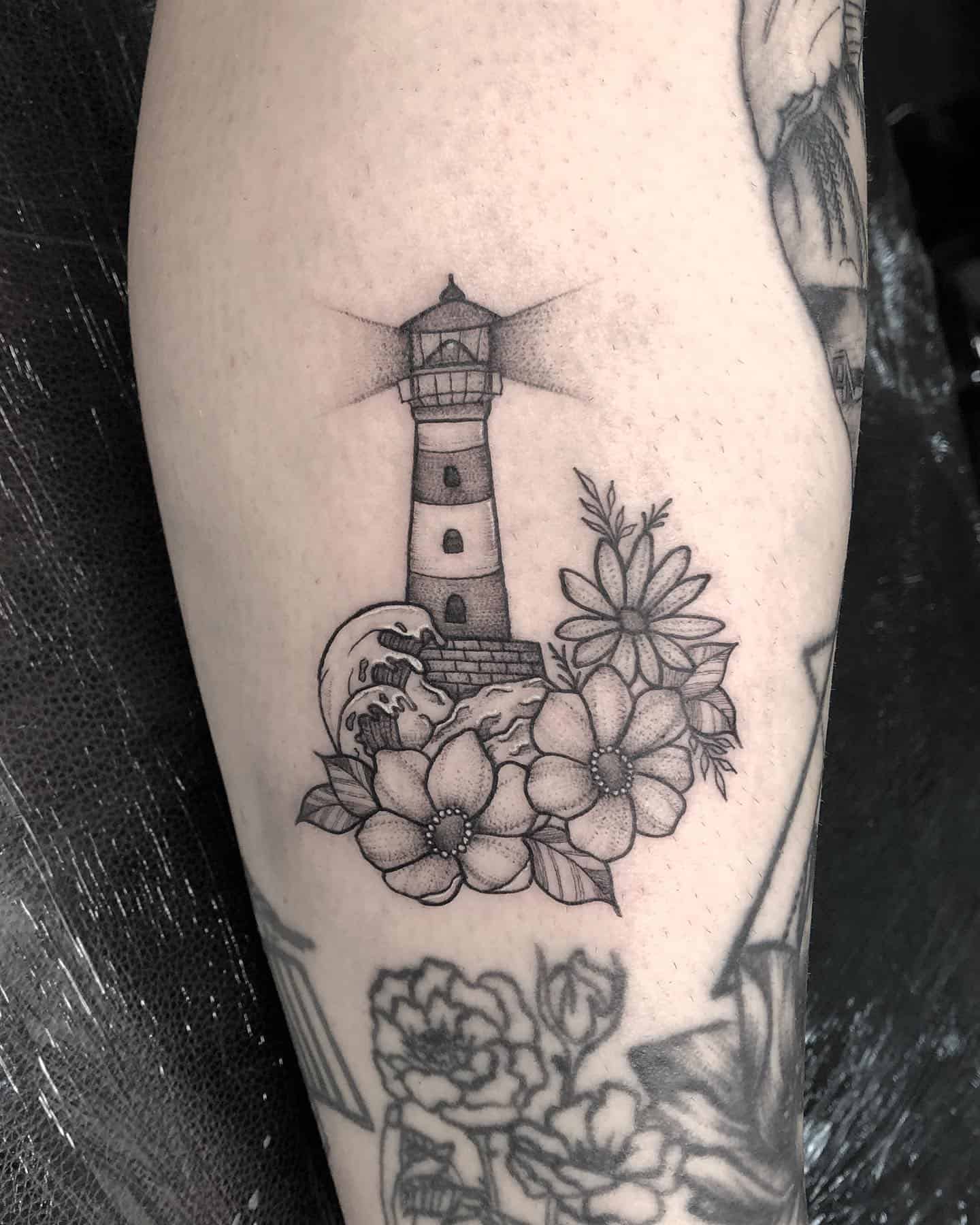 So obsessed with the contrast in this piece. The tattoo features a lighthouse rising above delicate flowers, creating a really striking visual.