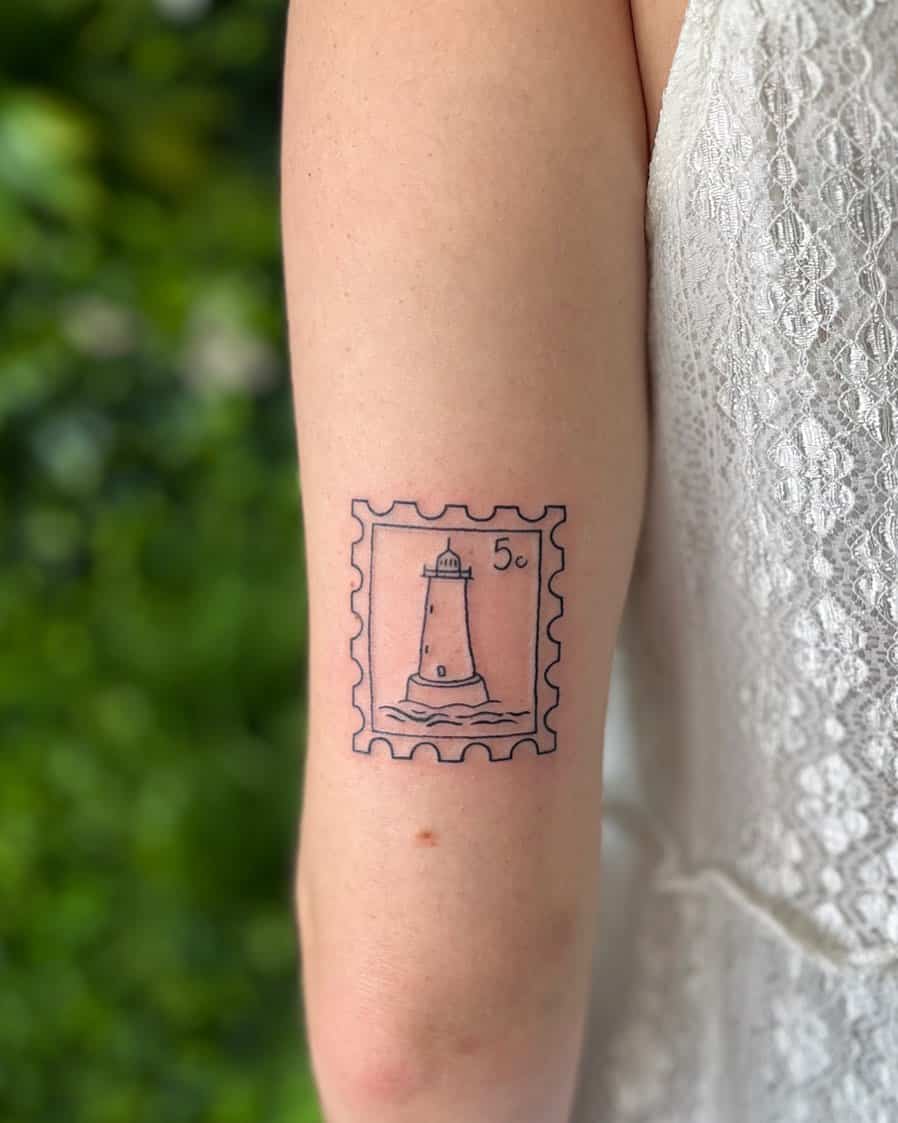 Okay, how unique is this? The tattoo showcases a lighthouse illustrated inside a stamp-like border, which creates such a cool visual effect.