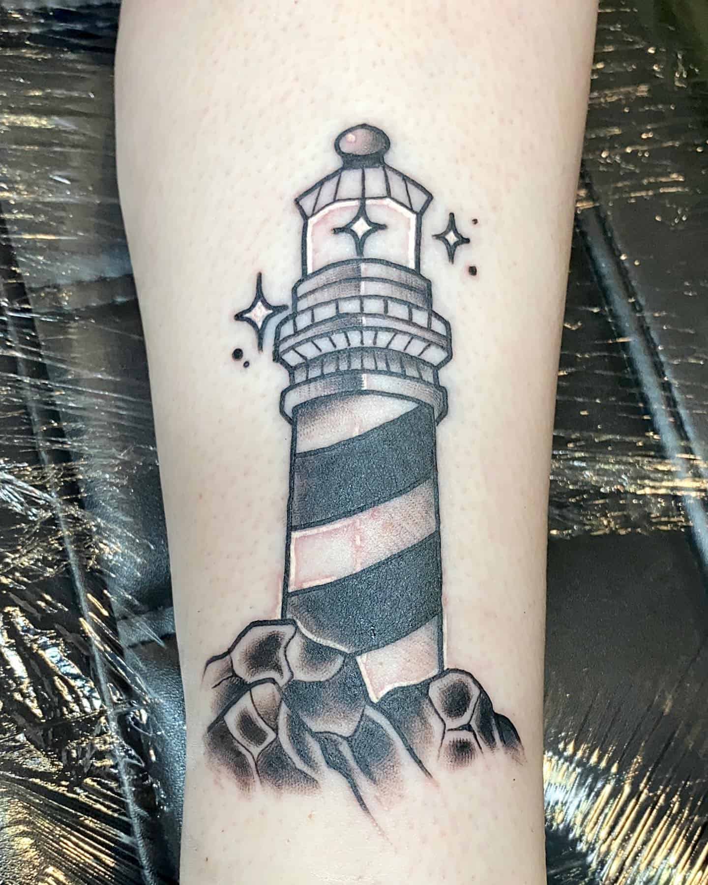 This one is so magical. The tattoo features a detailed lighthouse rising from rocky terrain, topped with a glowing light and surrounded by sparkling stars.