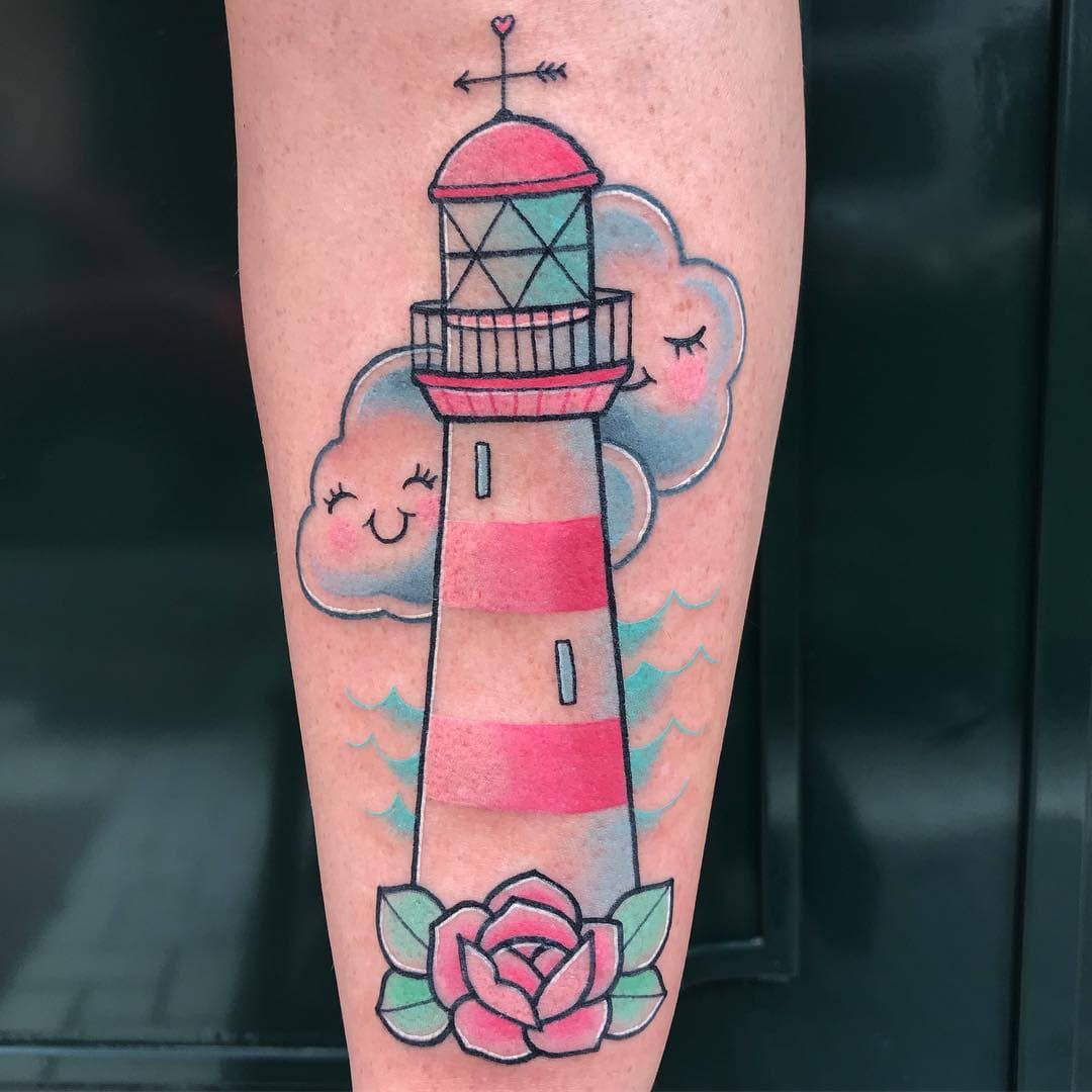 This is just so adorable and cheerful! The tattoo features a happy little lighthouse surrounded by soft, smiling clouds and a pink rose at its base.